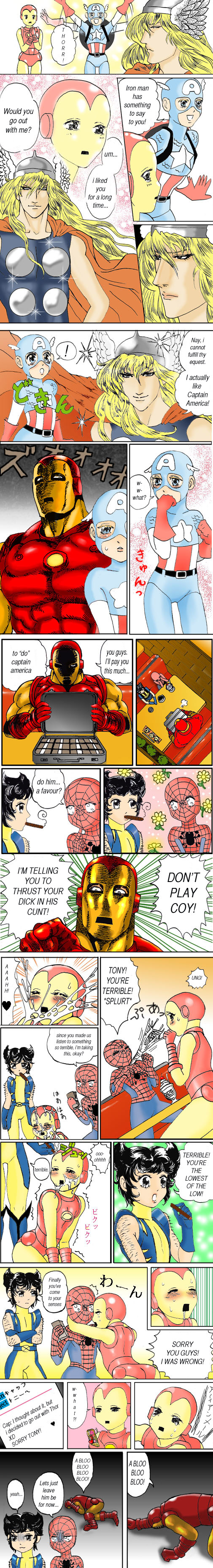 >>43965 >>44006I FINALLY WROTE THIS, I'M SO SORRY FOR THE MASSIVE DELAY.The Perks of Being an Avenger, or: How Peter Parker Learned to Stop Worrying and Love The Cock.The first thing that Peter thinks when his phone goes off in the middle of the night, rudely waking him, is: don't be angry. Tony Stark doesn't do timezones. But then, as he actually answers the phone, he thinks of a more accurate explanation: what Tony Stark doesn't do is common decency. Most times, he just acts the way he wants to and lets other people adapt to him. If they don't, he bends them into shape. So Peter answers the phone with barely a grumble.The reason that Tony is calling in the middle of the night might be a number of things, Peter thinks as he hurriedly tries to get into his Spider-Man costume. A sudden unexpected HYDRA stunt, or someone stealing the Horn of Gabriel and making a kraken attack the Brooklyn Bridge, or even Doc Ock getting his tentacles in a bunch and attacking the mayor like he did last week. As Peter struggles into the tight material, the phone wedged between his shoulder and chin, Tony tells him that what it's actually about is throwing Jessica Drew a surprise birthday party. Peter nearly drops the phone then. Nothing fancy, Tony says, just us and a hundred or so other capes, and also Peter should not forget that it's black tie."But I don't have a suit," Peter says. Well, this is not a hundred percent true, not really: he owned suit jackets and suit pants, but much like it was always the case with his socks, he did not own two pieces of clothing which, paired together, would make a respectable looking suit. And he didn't really mind, since his outfit of choice had always been jeans and a t-shirt."What do you mean, like not a designer suit?" Sometimes it is difficult to get these things through to Tony, but Peter supposes this is what it must be like inside the heads of multi-billionaires."No," he says, "I don't own a real suit, the kind you wear for weddings and accounting jobs." And the kind Tony wears for day-trips to Las Vegas on company time, occasions when he plays Guess What I'm Wearing Under the Iron Man Suit with giggling women, and parties which are too overcrowded to be private, he doesn't add."Accounting jobs? Don't be ridiculous. I'll tell Pepper to arrange something. Swing by Avengers Tower around eight, she'll be there with your measurements," Tony says, and before Peter can ask how is it that they even know his measurements, Tony hangs up.Peter plops back down onto the bed, half dressed and half in his pyjamas. He doesn't even bother taking the costume off as he starts slipping back to sleep. The fluorescent numbers on his clock say 4:13 and as the three flickers to four, Peter's eyes fall closed and he thinks, how weird must it be, being Tony Stark.-*Not as weird as it is being Peter Parker, standing in front of a full-length, three-sided mirror in an unpronounceable French boutique which is so deserted that it's either too expensive for anyone to actually be buying clothes there, or has been bought out by Tony specifically for this occasion - or, most likely, both.And then there's the suit he's wearing.Peter didn't think anyone could feel this strongly for a bit of cotton. Not since he was fourteen and got outbid on eBay on that top Kirsty Swanson wore in the original Buffy the Vampire Slayer did he have the aching need to own a piece of clothing. He never wanted to take off the suit. It was tailored perfectly to his shape, and his fingers itched to try and test how it would fare when he was hanging off the ceiling - although, for the amount of money that he figured it could probably be worn in the heart of the sun and feel only slightly warm. Before, Peter thought that one bow-tie was just like another, but this one feels so soft underneath his fingers as he fixes it that it would probably make grown women weep to touch it. Not that Peter's being vain or anything.Pepper clears her throat and Peter snaps out of it, meeting her eyes in the mirror. She is standing behind him next to the snotty shop owner, who looks like he itches to put Peter down in elaborate French, but is only prevented from doing it by Pepper's stern expression which seems to be permanently fixed to her face today."It's gr— it's perfect," he says."Great," she says, rather unimpressed and looking like she just wants to get on with it. "Bag it, charge it to Stark Enterprises and take it away," she says to the shop owner."No, Pepper, I can't let—""Peter," she says, smiling at him with compassion. "It's okay. Mr Stark can afford it." And you can't, she doesn't say.-*Jessica is delighted, if a bit overwhelmed. The cake is so big it probably can't fit through Peter's front door, and everyone sings "Happy Birthday" with varying degrees of success. It takes two more people to help her blow out all the candles, and she jokingly says that the number is deliberately that big to make her look old. Peter grins a lot that night: it might be due to the fact that everyone he cares about is there and they're all exquisitely happy for one carefree night, or because he had managed to pull off the birthday dance he had with Jessica without tripping over his own feet or in any other way showing his poor dancing skills.Spider-Man might be able to climb walls and hang from the ceiling, but pulling shapes on the dance floor was never Peter's forte. So instead he ladles himself some more punch, staying away from the more potent drinks kindly provided by Tony. He's probably compensating since he's not allowed to drink: Peter remembers Pepper politely, but resolutely, prying Tony's fingers off a champagne glass and replacing it with apple juice.The others don't seem to have the same hang-ups when it comes to controlling their alcohol intake. It's no speakeasy in the thirties, but things are getting a bit fast and loose as Clint Barton leads a gaggle of Avengers into a clumsy, but very enthusiastic and more than a little drunk 