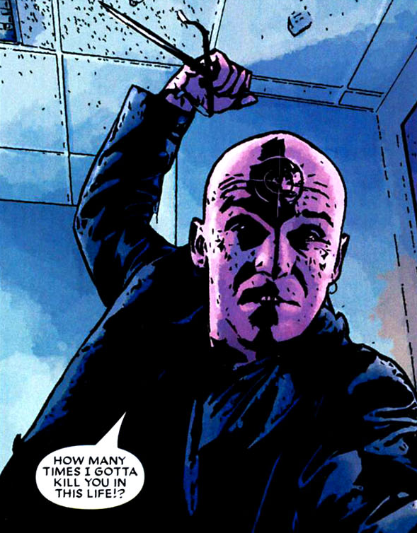 >>44035How exactly do you mean? Most artists have their different interpretations, but Lester usually looks the same in recent comics. The only real changes he's had... speaking as a Daredevil nerd here, he didn't always shave his head, but those were old, old comics. He's a blond, but recent comics always have him shaved so it always seems like a little bit of trivia to me (total aside: I think it would be amusing for Daken to discover Lester's hair color through... other hair, if you catch my drift, and be very amused about it). There was a time where he had nothing on his forehead at all, then he had the bull's eye as a tattoo, and then it was made into a scar, courtesy of Daredevil carving in into his skin with a rock. Good story, by the way.He dressed casually for a few arcs of Daredevil, but nowadays he'd always in costume. Either his own or Hawkeye's, but Hawkeye has been dropped with the rest of the Dark Avengers being shut down.To summary before I get into a really bizarre ramble here: Lester's bald, scarred, blue (usually, comics are inconsistent in eye color a hell of a lot) eyes, and he's pretty muscular but not too buff.... that was so much longer than it needed to be. Er. Was that the sort of answer you were looking for? I'm afraid I might have just went on a tangent about nothing, showing just how insane I am. Oh boy.