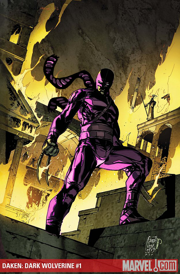 Well, the good news is that Daken isn't wearing his father's costume any more!The bad news is that one of the most /fa/ men in Marvel has apparently decided to wear a sort of gaudy bronze and gold ensemble with a giant condom on his head. First Noh, now Daken ;__;