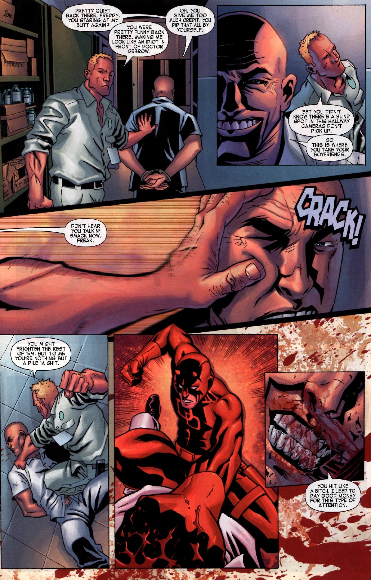 >>45965Me too. I cannot help having a really big attraction to dynamics like that.The best example is one of my favorite arcs in the older comics - despite having the crackiness old comics tend to have - is where Matt lost his memory, and Lester decided to parade around as DD to tarnish his name. Of course, Lester, being mentally unbalanced, let this get to his head and really started thinking he was Daredevil. In turn, when Matt figured things out, he dressed as Bullseye when he faced him. The entire fight was basically a mindfuck, revealing all these very compromising ideals they had of each other while they were pretending to be one another. This page makes me whibble in a very strange way.I really think the only fic out there is the one I've written myself... unless I'm not looking in the right places. It saddens me.