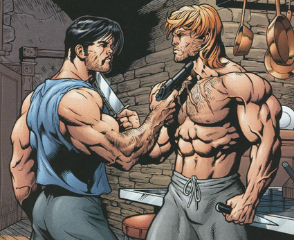 To keep the thread alive, here's something from the kink meme:He's not even wounded, is the fucking thing. Injured, maybe. Slightly distressed, like a pair of jeans. But not fucking wounded.It's a piece of - shrapnel, he supposes, from the plating of the armoured car they've just blown up, embedded deep in the back of his shoulder. It's not serious, Floyd knows straight off; there's a lot of blood, sure, but it ain't arterial, and all his fingers still move just fine. Blake, he will later be told, thinks he's been shot: in through the back, out through the front, bonus points if you clip both ventricles. He has "a little upset," as Rags puts it. Floyd sees the bodies on the ground and thinks it's maybe an understatement.After the battle, as soon as he's wrestled his mask off one-handed, Blake pulls him aside. Roughly, by the arm - shoves him down onto a bus-stop bench and starts angrily pulling bits of plating from his back. He isn't gentle, but he's precise, and the process is notably less painful than if Floyd had tried to do it himself. He takes a swig from his hip flask - offers it back over his shoulder to Catman, who doesn't even respond. The bandage, when tied, is too tight for comfort. They don't speak.He isn't sure what any of this means, and the night is settling around them. There'll be more trouble if they hang around here too long. He shoots a last look at Blake, sitting flagpole-rigid on the bench - clenched hands staining with Floyd's blood - and he turns to walk away.He makes it a block before he hears Blake's quiet footsteps behind him. He is going to stop, to wait for Blake to catch up, but instead finds himself suddenly, violently shoved down an alley, out of the half-hearted flicker of the streetlights.Blake is at his back, pushing him forward until the alley brick grit is rubbing his face raw. His hands are somewhere between Floyd's shoulder-blades, scrabbling for some catch or other, and when Floyd reaches back to help he gets an audible snarl and an open-handed swat upside the head. Jesus, says Floyd, into the brick. The force of Blake's determination is rubbing his burst lip against a crack in the wall - the blood smears before his eyes, and he sucks it sour-cherry into his mouth.Blake gets the catch open. Floyd's neck guard opens at the back, falls to the ground with a too-loud clang.And Blake's fucking biting him, not nibbling like some inexperienced co-ed nympho but fucking biting, open-jawed, hard enough to draw blood, maybe, definitely. His hips are pressed tight against Floyd's ass, but he can't feel his cock through the armour. And Floyd - Floyd's so fucking hard he can't breathe. He bows his head against the wall and tries not to thrust."Bend your damn head," says Blake, all raspy, and when Floyd does, he gives a last lingering squeeze of his jaw before pulling away. For a moment Floyd thinks Blake will mount him from behind, unprepared, in this awful piss-stained dead-end in the rain. But Blake turns him roughly around, and looks at him with a lean, unkind face. He's got a thief's face, Floyd doesn't say."You don't fucking die," says Blake, in a low voice, "until I tell you to die."He sort of wants to laugh. "Catman -"