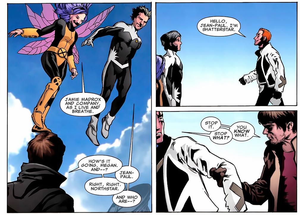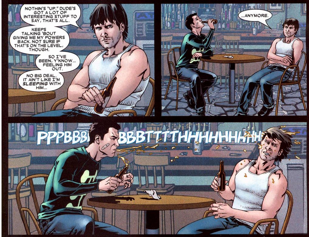 >>55413And quite literally, too.What Rahne did was pretty awful (understatement). She was probably rather messed up emotionally. The real father of her child was presumed dead, and she probably had expected some comfort from Rictor.What irked me was the way she looked at 'Star right before lying to Rictor. It ggave me the impression that she did it at least partially to upset Shatterstar by taking away Rictor from him. /Extremely/ shitty thing to do, but I guess the truth will eventually come out.I must say I'm rather pleased with the direction PAD is taking the story into. As PAD himself mentioned, the relationship between Rictor and Shatterstar is strained by the fact that they are at different points of their emotional development; Rictor is ready to settle down, 'Star is still figuring things out.I've seen folks @LJ mentioning that PAD should make Rictor flirt with somebody to make him jealous - personally, however, I thought it was a bad idea. Shatterstar is too emotionally confident to be threatened by flirting; he would just see it as a confirmation that Rictor willing to experiment.Pregnancy, on the other hand? Shit just got serious. I have a feeling things are gonna get worse before they'll get better... Gif relevant.