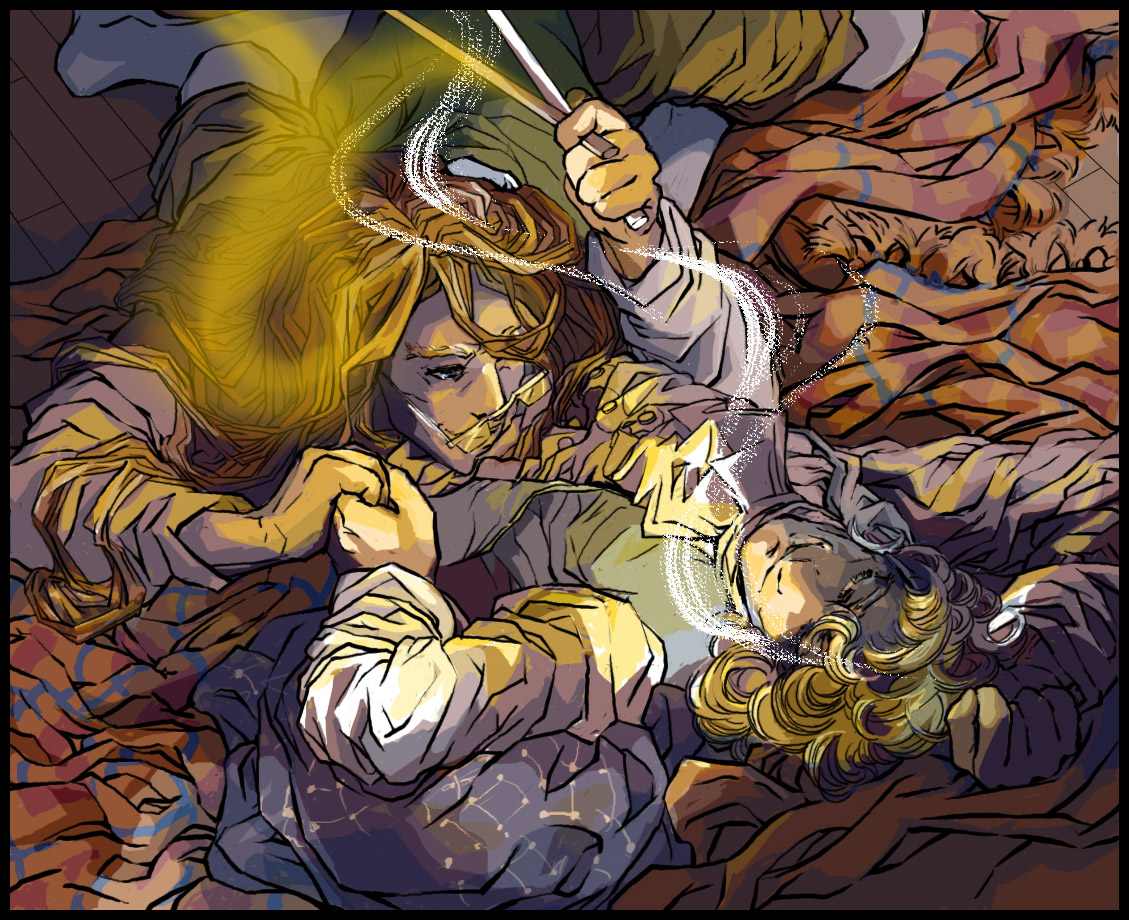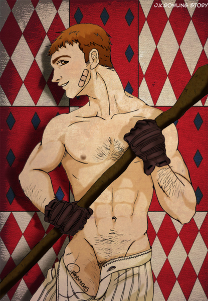 Hey guys, I want to /r/ a fanart I haven't seen in a while but has haunted me: It's Percy, fallen asleep on his book while the Gryffindor team plays outside. He dreams that Harry is blowing him while Oliver Wood has his mouth on his ass. Pretty high quality art, too.Anybody have it?