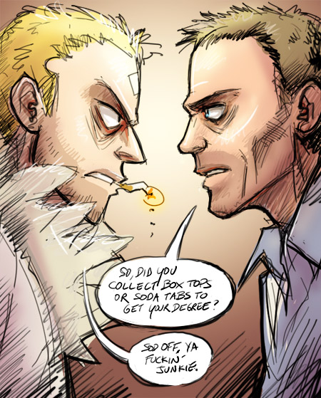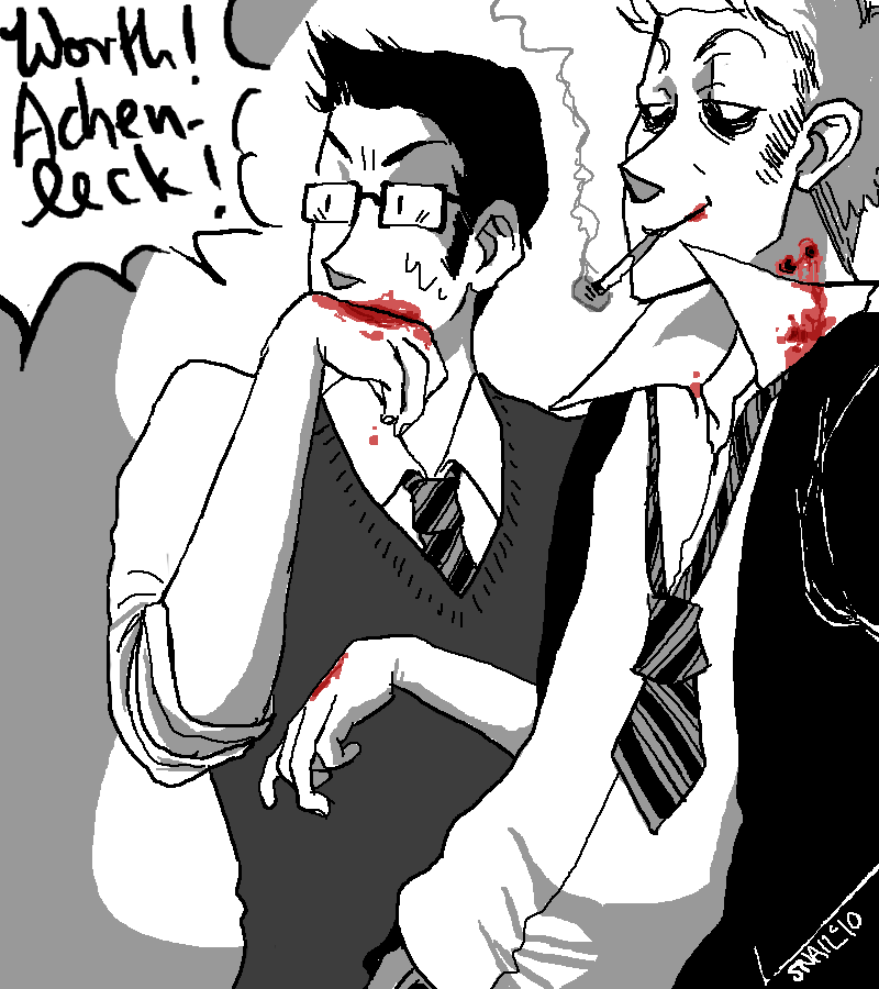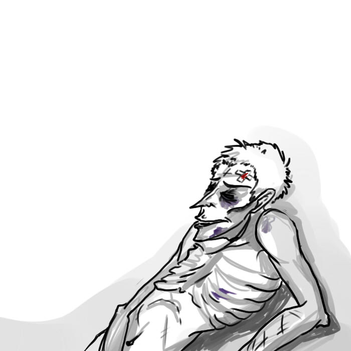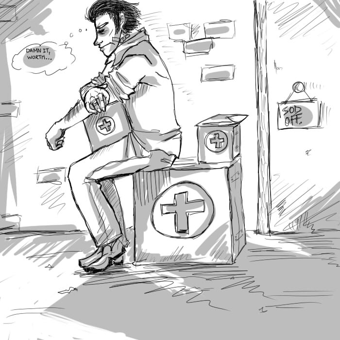 ITT DRAWFAG TRIES TO BE A WRITEFAG----------------------------------Worth sat at his desk, feet propped up and chair leaning as far back as it could go before it would topple over. The top drawer of the desk was open to his left, occupied with a large tray heaping with cigarette ash. Really, an ash tray stopped being useful LONG ago, even before his chain-smoking days. Now an entire drawer did just fine. Besides, he wanted to see if he could fill it (he was halfway there). This was his setting, his perfect habitat. A Worth-ecosystem of grime and soot and smoke and blood. Ah yes, blood. The doctor wasn't merely sitting after all. Bent cigarette perched in his mouth, he rested his forearm on his lap and watched the blood dribble uselessly down onto his slacks. It was soothing for him in a way he couldn't describe. It felt /good/. Almost like fucking."heh." He huffed bemusedly to himself, the ash from his cigarette falling from the bounce of his lips and settling into the bloody gash on his arm. Soot and red mingled before being swept away in the (ever slowing) flow.Off in the distance he could hear footsteps making their way down the alley. Alone time was done, for the moment. The emaciated blonde expertly wound a pressure bandage around his arm and pulled the rumpled fabric of his coat back down. Seconds later there was a tentative knock at the door. Worth merely stared. If whoever wanted in badly enough, they could let themselves in. Nobody he was interested in would merely knock a few times and give up. Well, unless they were like that poor, mislead man with the bible determined to sell Worth on the merits of godliness. That, needless to say, was a night of entertainment he wouldn't soon forget. "Hello?" a muffled voice called from the other side of the door. "Is anyone inside?" " 's unlocked!" Worth snapped, sliding his feet from his desktop back onto the ground. "damn idiots 'd die bleedin' and knockin'..." He muttered, watching the doorknob turn and the door push inwards. "Pardon me." A tall man in incongruously nice clothes stepped inside his office, carefully closing the creaking door behind him. "Are you Doctor Worth?""Yeh. What'd you want, fancy-nancy?" Worth stubbed his cigarette into his butt-drawer and slid it shut as he stood. s'pose you're looking for something, otherwise you'd be on the other side'a town." God, he hated small talk. At least his addict-clientele had the decency to get to the point."A-ah." Ples paused, an awkward silence filling the space between them. Although Hanna had warned him about Doc Worth, he was unaware that such a combination of personality traits could truly be mixed into one man. "My name is Ples Tiebenoch. I was referred here by Hanna Cross." Ples explained, wringing his hands behind his back. "I'm in need of assistance from a Doctor a little more open than the standard..."The gash on Worth's arm stung and throbbed from the pressure bandage. Although nice, it served only to annoy him at the present. It made Worth feel more impatient (he was always impatient, after all). "Yeah." Worth said, more of a punctuation than a reply. The thin doctor stood, turned heel, and began to walk into the "examination room," assuming the awkward Mr. Tiebenoch would follow. "What seems t'be the issue." Worth muttered, gesturing to a plastic lawn chair that was assumedly where his patients would sit. Ples gingerly crossed the room and sat, folding his hands nervously in his lap. "I need some...medication." He said hesitatingly, embarrassed. After the entire incident leading up to him meeting Hanna Cross and his interesting comrades, it was insisted upon that Ples try to find a way to qualm his inner demons. Apparently, his efforts alone were not enough. If anything, he owed it to the poor boy named Vesser who he was now responsible for.Worth cleared his voice impatiently. Apparently this British guy was a complete space case, drifting off in the middle of an explanation to nervously stare at the cracked tiles on the floor. “ah HEM.”"M-my apologies." Ples jumped, eyes nervously shifting to the wall instead. "Perhaps a sedative, or...risperidone..." His voice faded away quietly, shame apparent. He did not want to be seen as anything but sane and put-together. "Really? Is that SO?" Doc took a few long strides until he was uncomfortably close to the seated man. "An' why might you need THOSE kinda meds?" Worth grinned cruelly, smile looking like a strained slash across his face. "D-does it matter?" Ples pleaded with his eyes, only able to hold contact for a moment with the crazed looking man before him. "I will pay you well." "Now now, bein' a Doctor 'n all, it's import'nt to prescribe you the RIGHT stuff." Worth leaned forward, nearly nose to nose with the nervous man. He could see the poor brit squirming in his seat, as well as hear a strange ticking noise coming from him. "P-please now, Doctor." Ples could feel those eyes boring a hole into the middle of his forehead. "Please what?" Worth asked, roughly dropping one of his hands onto a boney shoulder of the increasingly uncomfortable patient. Perhaps this visit would be more interesting that he thought...Ples swallowed, one hand drawing up but stopping inches short of brushing the intruding hand off. "P-p-please d-don't..."Worth cackled and dropped his other hand onto the remaining shoulder. "Don't what?""To calm my nerves!" Ples sputtered out the first lie he could think of. "T-that is why I need those medications.""C'mon now." Worth's words seeped into the dirty room as if they belonged to the grime and dust in the first place. "you 'n I both know risperidone ain't for no nerves." The cruel doctor was leaning his weight through his hands and onto Ples' shoulders. Pressing him still. "mebbe you just need t' learn t' lie better, too."Ples felt dizzy, heart thumping erratically. Why did he do this? in hindsight, it was a terrible idea. Perhaps he could just go home and drink some scotch, go to bed, and sleep this a