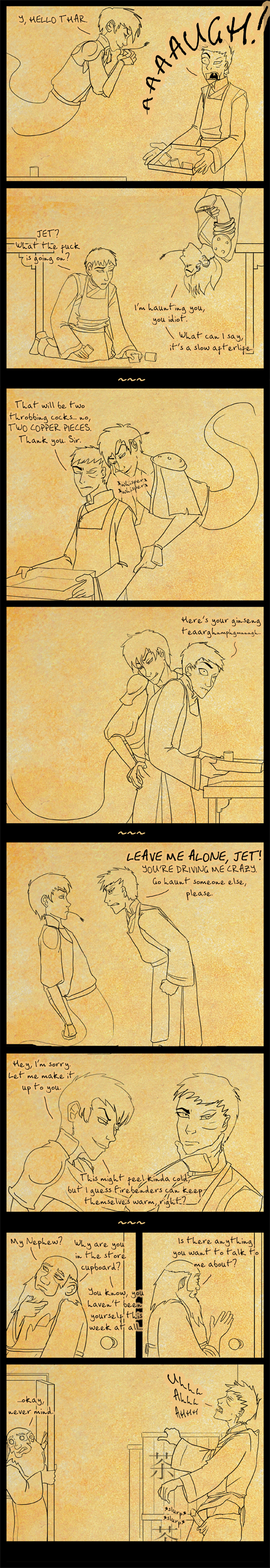 >>47234'Float': an alternate ending to Crossing, utilizing Jet/Zuko AU Conceit Number One: So what if Jet didn't see Iroh firebend at his tea that one time? Although I like to think it goes off in a pretty different direction than most. Assumes the first half of Crossing happened, and replaces the second half:http://sodomquake.livejournal.com/tag/float