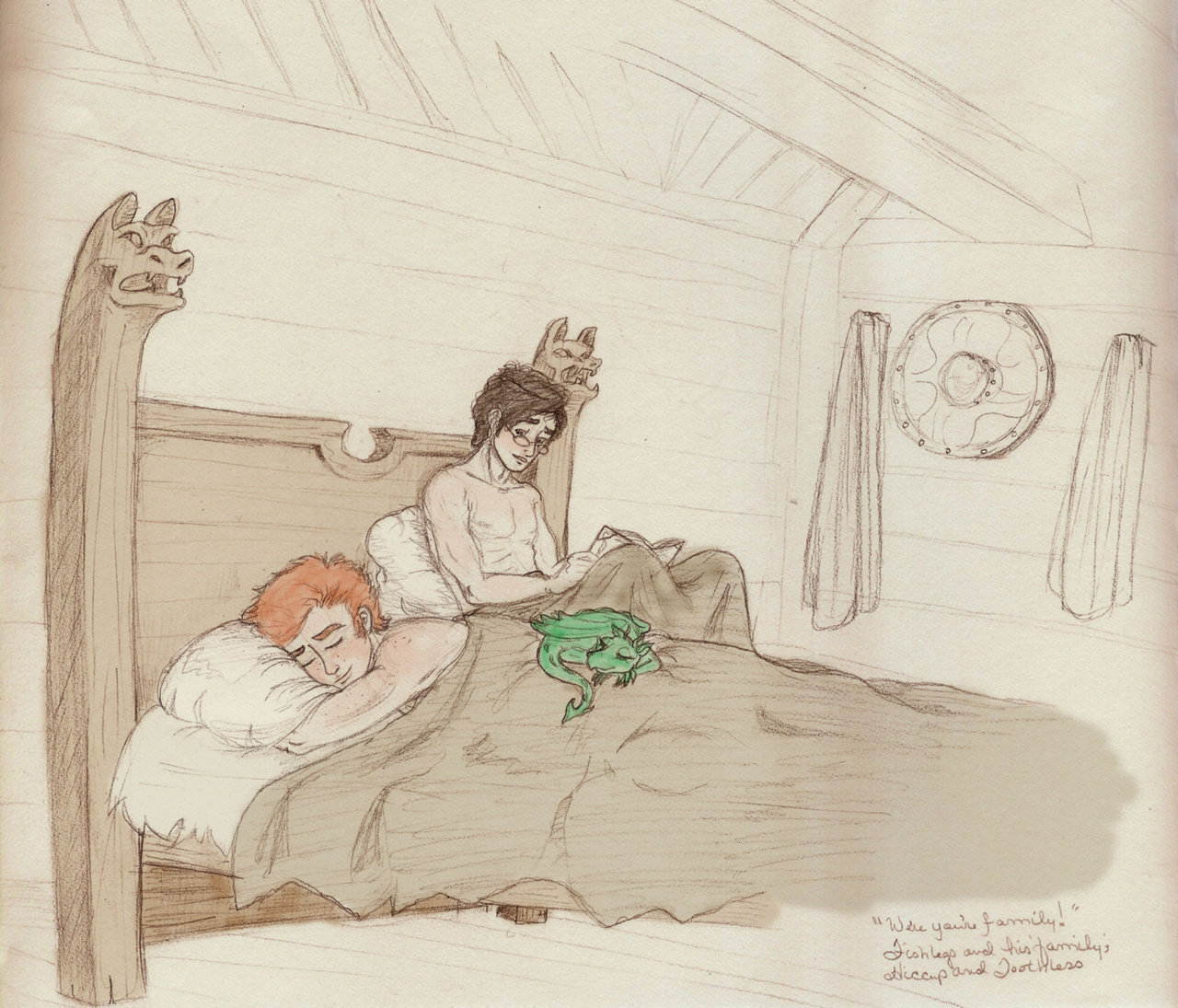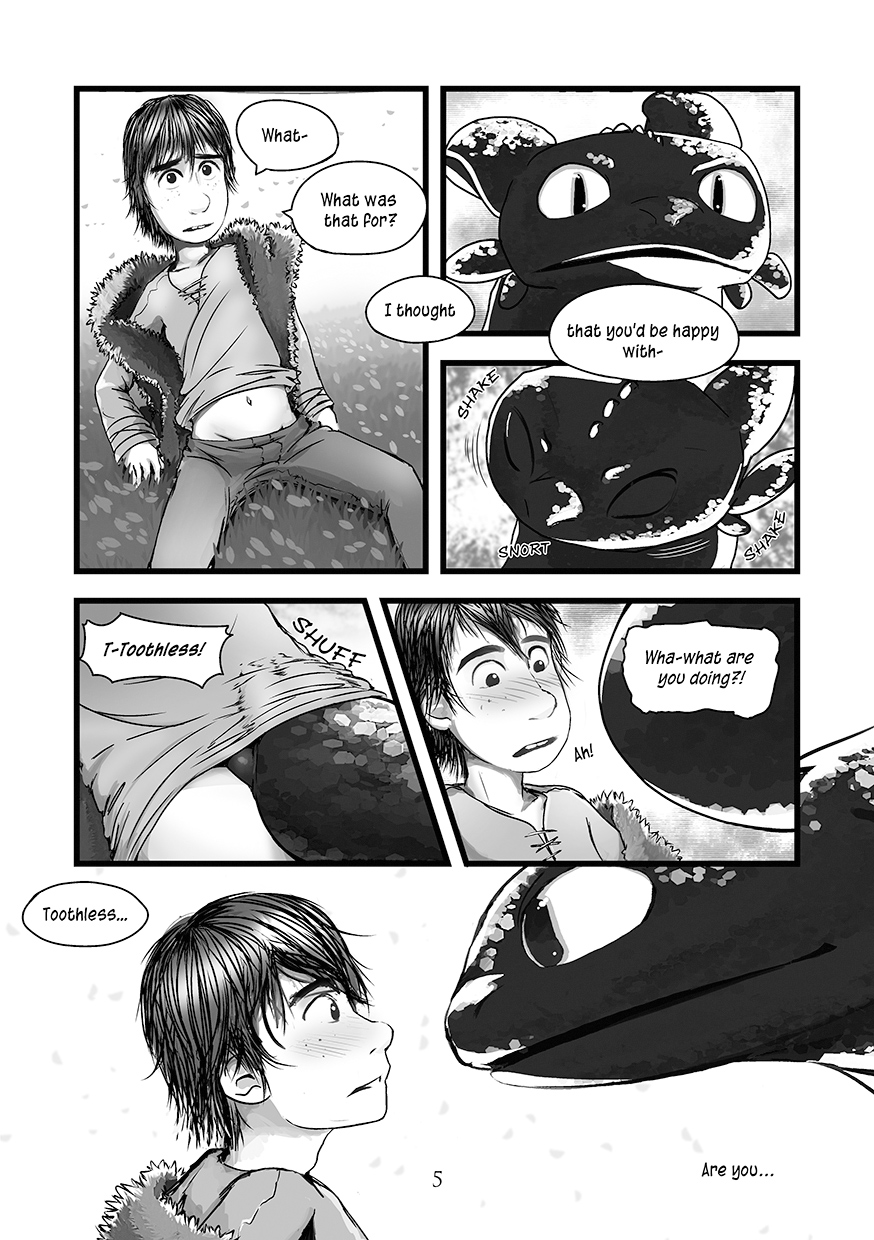 Hiccup rose from his bed limping slightly, the floorboards creaked beneath his footsteps, it was the only sound heard above the rushing wind and the stiff crackling from the fire-pit. The edge of his blanketing, bearskin glided across the wood as he stepped towards the massive of dragon taking up the center of the room. It had been so long since he’d attempted, or even considered touching the sleeping beast. Shiny black scales reflected the guttering flames and Hiccup watched the dragon’s ribcage expand and contract like bellows. So like the forge and its welcoming heat, he inched closer on unsteady legs. Toothless did not notice his approach, so deep in slumber; Hiccup doubted anything would make the creature rise, but remained silent all the same. A twinge of uneasiness bubbled up inside him as he faced the reptile; his heart began to pound, taking the beat of heavy war drums as the dragon slept on. Orange flames licked the bulky form, an ear twitched and Hiccup stared, the obstructed memories flooding to him like the sticky dragon seed that had once coated his insides. The shock, pain and burning arousal were suddenly fresh in his mind; he flushed clutching his furs tighter about himself. He'd writhed beneath the dark dragon, his howls and bobbing cock confirming the terrifying truth that he’d enjoyed it, the delighted growls and oppressive heat of their entangled bodies.With startled moan the teen fell back clutching his chest, eyes wide in panic. His manhood throbbed in interest, suddenly uncomfortable, much like his leg on exceptionally cold, wet days. It was just one of those scars he’d bear for the rest of his life likened to one borne by the dragon snoring upon the smoldering wood. The heavy half-finned tail thumped upon the floor, its movement kicking ashes and sparks into the air. Green eyes focused in an instant and Hiccup was there high above that lonely island clinging tight to a wet saddle as his black dragon bore them higher and higher as they beckoned the Queen to follow them into the clouds.It had all gone according to plan, or as well as one could plan, to defeat a monstrous creature larger than one's village. But they had done it, ended the threat to their lives and united their people as a larger clan. However, that success had come at cost and he would gladly pay it again, without question. With another heavy breath, Hiccup staggered for a moment before he was back to himself in the white noise and heavy shadows of his home. The fall, the tumble from dragon back; it all could have ended much worse, but he banished the thought and forced himself to take another step towards Toothless.He's missed his dragon. Yes, he'd been afraid, but now months later he didn’t know what to think. The Night Fury had forsaken familiar cave or cove and had nested in the home of the human who'd taken flight from him. Worry won out over fright and Hiccup moved closer the great mass of scales planted upon the cracking pit. With trepidation he put his hand on the dragon's snout, it was cooler than he'd ever felt it, but the breathing steady. A small almost relieved smile crossed his freckled face and he gave the nose a gentle scratch.Slowly as if not quite dead the dragon stirred, his head shifting up from the charred wood so he could blink drowsily in the direction of his human. Hiccup’s breath caught in his throat and he didn’t move. Gradually, as if trying not to spook him further the jaws parted below the half-lidded eyes glistening in the smoke and Toothless dragged his tongue over the outstretched hand. Hiccup gasped and the dragon trilled soothingly before his head drooped and he moved no more. No matter how much noise filled the Chief’s house and no matter how the young man stared, the dragon didn’t stir again.The rest of the winter was filled with evocative stories and more drawing than Hiccup had ever done in his life. He didn’t go out and join the others during the numerous rounds of Knattleikr in piles of snow. His wrought appendage wasn’t suited to scrabbling along the ice, it could be with adjustment, but then again he wasn’t a very good batter anyway. He could beat the entire village at Hnefatafl so the amber kings sat forgotten on their field, the board set high on the shelf earning dust with disuse. Instead of remaining bundled in his bed Hiccup sketched the sooty shape of the snoring dragon, as his father carved furniture and figures. It kept him busy and out of trouble, a fact which many of the villagers were thankful for. It was still another few months before the dragons began to wake fully, but as Hiccup waited stroking charcoal over parchment, it didn't seem long at all.Each night a skald would take the floor of Meade Hall, with an account of some legendary hero or the tricky exploits of Loki. Once a red faced man proclaimed the tale of Hiccup the Useful, and the warriors slammed their flasks on the tables in uproarious applause. Hiccup flushed red and vowed to ensure the actual facts of his deeds were recorded for posterity. It wouldn’t do for the younger generations to believe he’d merely tamed Toothless with the sheer force of his personality. His mind balked at the thought of the dragon, when would his erstwhile companion finally awake? Hiccup hadn’t realized how much he’d been avoiding the dragon until Toothless was inadvertently avoiding him. He’d been such an idiot, recoiling in his pain, and causing it in his closest friend, and dare he say it; mate. Toothless couldn’t fight instinct any more than he could defeat his freckles. It was a deep intrinsic part of the dragon’s nature. And in some small sick sort of way it was sort of nice to be desired, even if it was by wrong species and gender. His thoughts were well taken when the season changed once more; leaving him busier than before as Berk began to warm.The first sign of spring wasn't the cacophonous cracking of thick ice sheets, nor the tell tale green shoots worming th