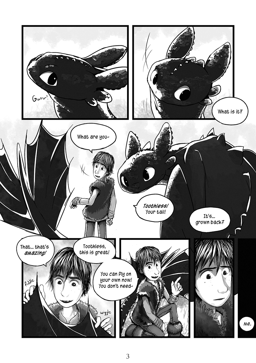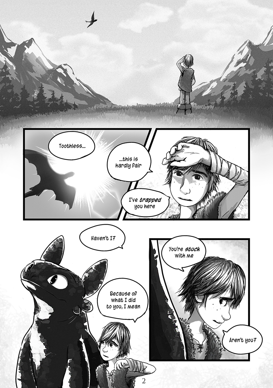 Suddenly his eyes were open and his breathing labored. He was alone but the fire crackled merrily, giving the circle about him a sunset glow. Blinking groggily at the reawakened flame, he was soon aware of the pressing need to leave the protection of the furs. His leg was achingly cold to his hands and practically unbearable attached but he made quick work, hobbling from his spot into the woods for relief.His return to camp was hampered by old trees and fallen logs in the dark, so he took slow, following the moonlight filtering through the pines. Just before he reached the beach and his bed roll, Hiccup stumbled across a recent hunting trail. He followed the dragon's tracks without hesitation, the stamped brush and broken twigs leading further into the woods. The path ended at the foot of a large tree, but it bore the earmarks of sharp claws, so he knew exactly where the dragon had gone. Deeper into the shrubbery, Hiccup scanned the forest line searching for his friend. The trees thinned out and he spared a glance into the tangled canopy, there he spotted a single flash of red, a welcome sight. As he moved towards the tree, a crunch of the underbrush halted him midstep.The noise was too soft to be Toothless so he was quite ready to ignore it, but it came again and he listened with trepidation. It was a warning, he realized. A snort that was much too soft to be a dragon and too close to be anything safe. He leaned back trying to catch a glimpse of the other creature but found nothing. Movement behind him caught his attention and he spun for a better vantage. In the edge of the clearing, he spotted something. His eyes followed the indistinct shape, focused on the deep brown pelt blended in with the tree line. The reindeer was large; its antlers seemed to be branches as it emerged from the foliage. The cow stepped forward, its movement graceful as it stared him down.Returning its gaze, Hiccup took a hesitant step back, his hand straying for the knife at his belt.The animal snorted again and shook her head. Her gaze didn't waver from the young human in the path and she pawed the earth in warning. It was just one of those nights he decided casually taking another slow step. This was exactly why hunting parties were comprised of more than one person. He was in the wrong place at the wrong time; the Gods really had it out for him didn't they? If he could just back out of her territory, or if Toothless was feeling charitable, he'd be fine. Otherwise, the population of Berk was about to be one person smaller.She stalked him, puffing up her furred chest, standing tall to drive him off. As he backed away Hiccup was careful to avoid the ever present pitfalls of raised roots, rocks and holes. What he didn't miss was the branch of the dragon clawed tree jutting low from the trunk behind him. The limb felled him and he tumbled forward into the path of the advancing reindeer. Long legs with heavy round hooves were coming ever closer to his head. His eyes flicked up towards the intermeshed treetops, but there was no dragon in sight. Toothless had probably moved on.It was up to him to save his own skin. He could handle that, he'd faced worse. Much worse. His shoulder twinged faintly as he drew the knife, sliding into a kneeling position, one that granted him balance and mobility. It seemed some of Gobber's lessons had stuck with him after all.The reindeer lunged forward with her head lowered and Hiccup rolled to the side avoiding the swing. A stamping hoof just missed his head and she bellowed angrily. Picking himself up from the dirt he ran, leaping over a rotted log moving for the safety of the beach. If he could just get away, he'd be fine. Unsatisfied with this retreat however, the animal followed, closing the distance between them. She thundered over the dark earth as he scrambled away. Moss and twigs crunched under his feet as the mammal dogged his heels. He skidded on the damp litter, and tumbled again, dodging a wild charge as his thighs burned from the exertion.It was close, she was close. He couldn't keep running.Bracing himself Hiccup Horrendous Haddock lifted his knife and waited for the cow to attack. Near enough to feel the heat rolling off the deer's fur; he feinted just as she rose up, bringing her sharp hooves down towards his face. He struck, pushing his unimpressive weight into the blow, just as a massive shadow descended from the trees crowing loudly. In a flash of dark wings and sharp claws, the reindeer went down under the weight of a Night Fury, limbs swinging wildly as it fell. They hit the dirt mere inches from Hiccup wobbling on his feet, but impact of a lashing tail caught him by surprise and he toppled with a startled sound..By the will of Skadi and a stroke of luck, Hiccup landed across the cow's shaggy neck, balanced awkwardly upon the frilled head of the Night Fury he'd been searching for as leaves rained down around them. He panted, shaking against the dark form, to his surprise Toothless wheezing as well, the dragon was out of practice it seemed. Even so they were the victors, over their furred attacker. Hiccup smothered his incredulous laughter, but just barely. A green eye caught his gaze and Hiccup placed a hand to the scaled chin. Toothless snorted in acceptance and prodded the human with a wing. The reindeer jerked beneath them, and the moment was over.
