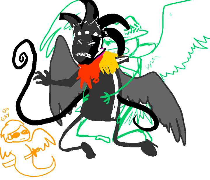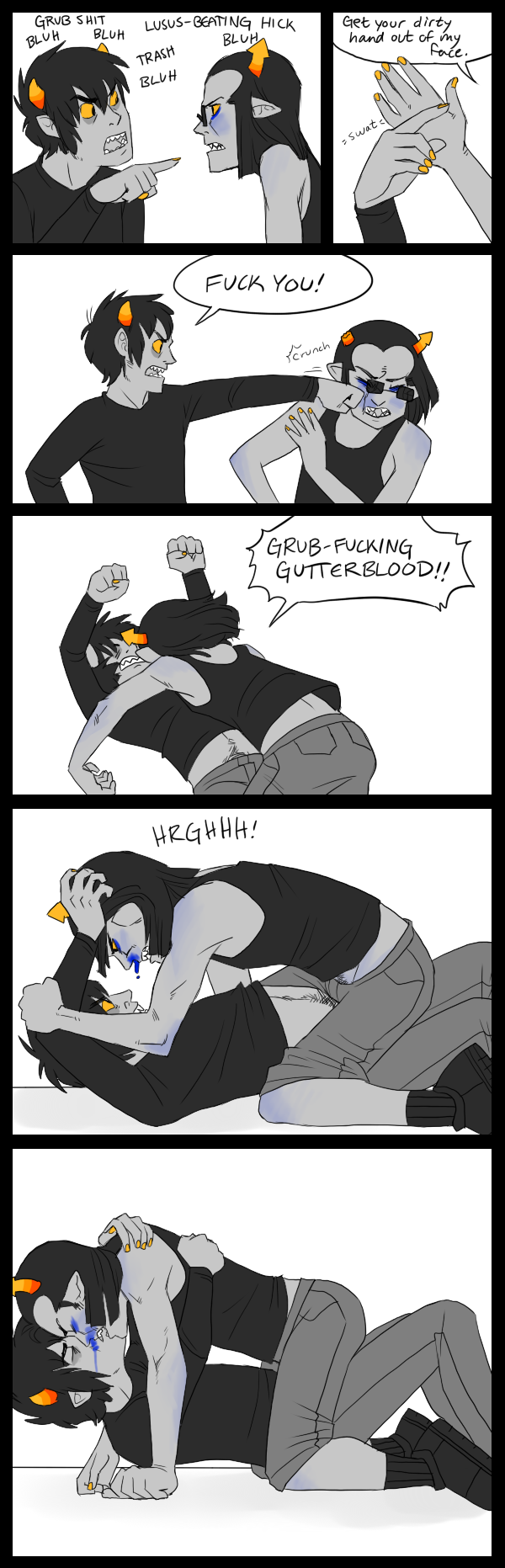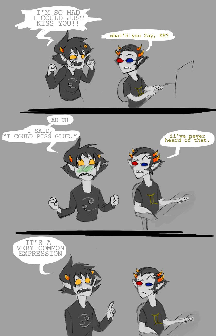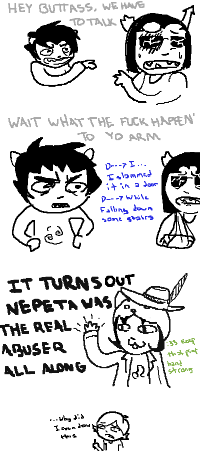 >>48976It's obvious that cT is extremely violent (which begs the question - how did he bust out his teeth and snap off one of his horns? A fit of rage resulting in a rampage?), but I just can't see him actually beating up any of the other trolls. I certainly don't think his relationship with Nepeta is abusive (she seems to look after him, really). He might just be the kind of guy who throws a holy tantrum whenever he's pissed off.And I agree with >>48979 - an uppity snob being put in his place is something I would enjoy, hehe.Also more awful sketches. Imaginary hate make-outs.