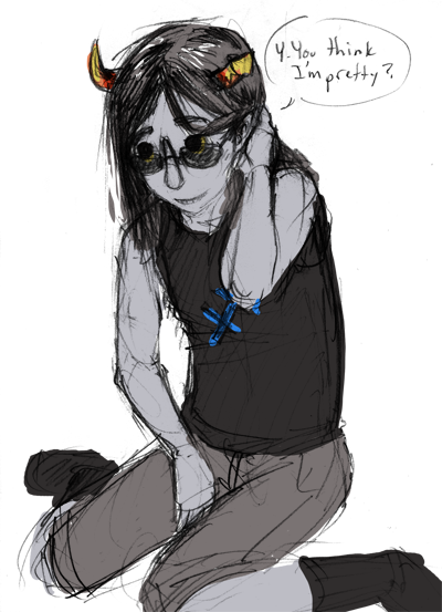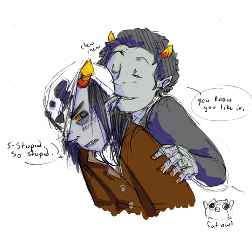 >>48976It's obvious that cT is extremely violent (which begs the question - how did he bust out his teeth and snap off one of his horns? A fit of rage resulting in a rampage?), but I just can't see him actually beating up any of the other trolls. I certainly don't think his relationship with Nepeta is abusive (she seems to look after him, really). He might just be the kind of guy who throws a holy tantrum whenever he's pissed off.And I agree with >>48979 - an uppity snob being put in his place is something I would enjoy, hehe.Also more awful sketches. Imaginary hate make-outs.