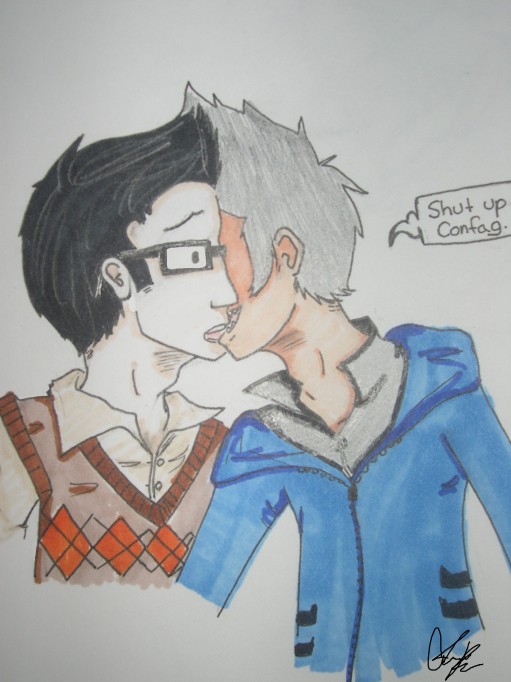 So, de-lurking with a pic. Its just a quick sketch and coloring I did today and my friend really wants me to post it.Sorry for the really crappy quality and skills.ConVes pairing just becasue.