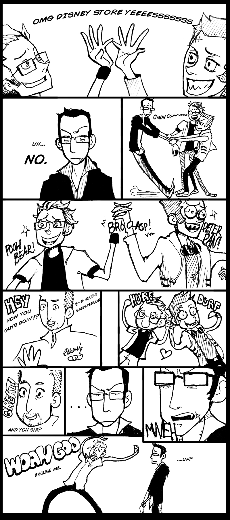 I have been told to post this. True story.I went to the mall on Saturday with my cosplay group. Before our Worth and Young!Conrad showed up, Hanna and Veser dragged a very unwilling Conrad into the Disney store. The events documented in this comic strip are almost 100% accurate.I apologize for the lack of porn. I hope the lulz will suffice? I will post some porns later when I have some to post!