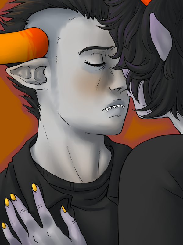 >>50996First off, thanks for getting it back on page one.Secondly, this is chest-achingly sweet. I saw this on the fora (while it was still working for me) and I was going to comment on it, but the servers keep flippin' the fuck out. Seriously though, the detail is wonderful (especially, almost weird to notice, in the ear) and Tav biting his lip... it's rather lovely. Also, is that some Gamzee sans make-up? It looks like it. (Which would also be fine by me.)(On a side note, I swear I'll have some fic written soon. All this fora business combined with the clusterfuck that is Clusterstuck has been dogging me down.)