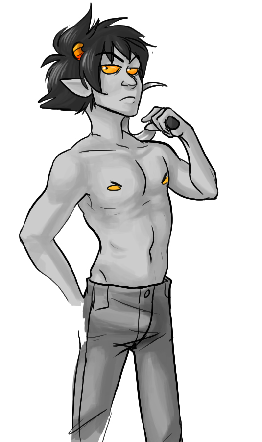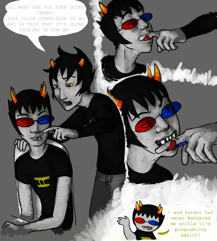 Okay. MyLuckySeven, the artist of >>50254 is already coloring that later in her livestream, so I am noooot gonna waste time with it. Back to Equius/Karkat fanfic.