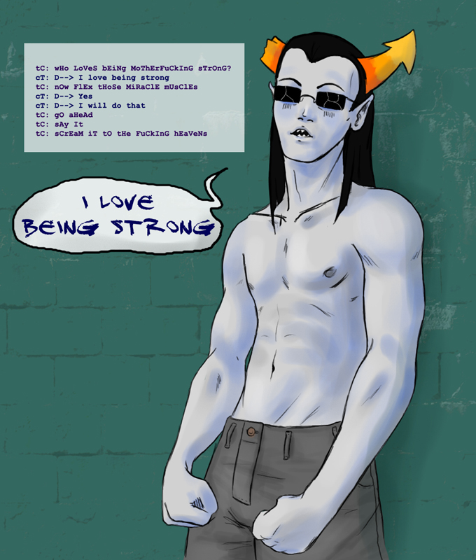 >>49967If your writing is half as good as your art, you'd better fucking post that fic. I was a little late getting on board the strongtrain, but Equius won me over with "%%" even if I still think his name is stupid.