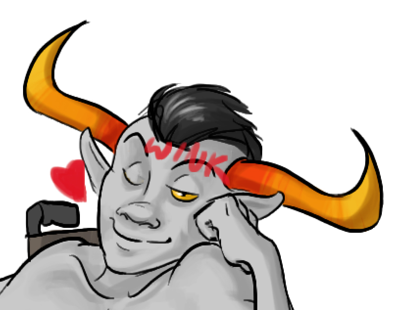 All right, I can't sleep, but I'm not in the mood to draw anything. So I'm working on a fic that was a request on the Homesmut kink meme. I think it's going all right... It's not hard to write Tavros or Gamzee, so hey. I'll stick it here when I'm done.