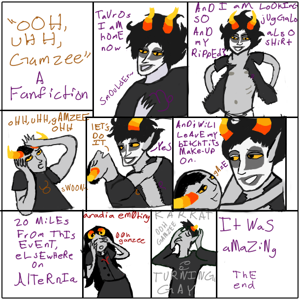 >>51166I am also in the process of writing a Karkat x Sollux fic right now. Does this make us bitter rivals?>>51168It's always weird for me to see Gamzee without makeup, but you managed to capture his sexface perfectly. >:3