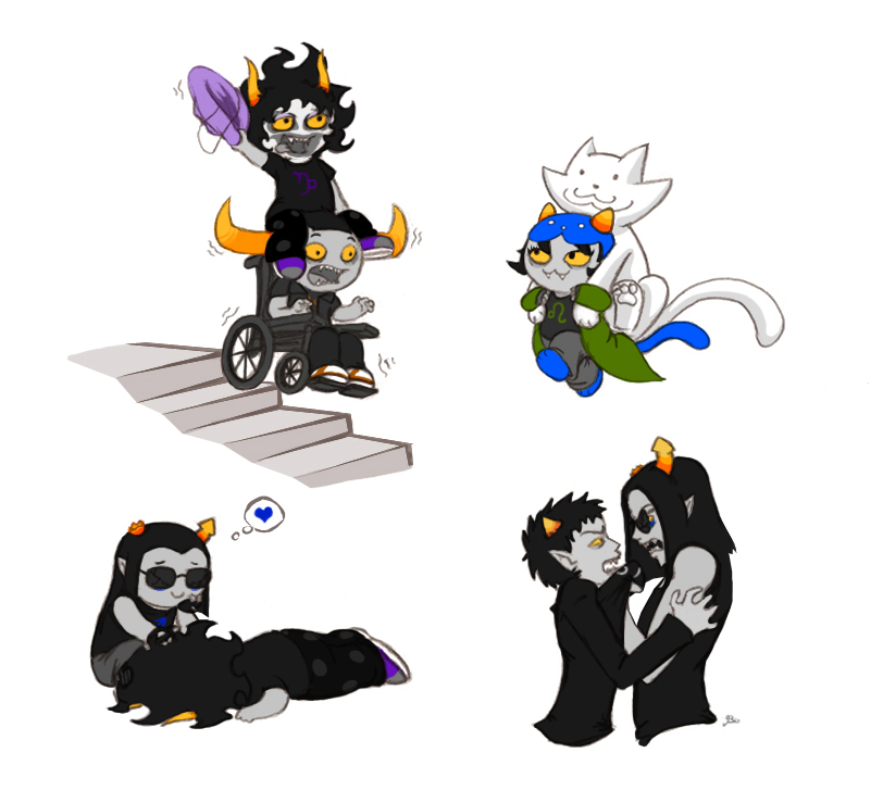 >>52020Sollux bolted down like lightning, hoping to get to the big-horned idiot in time--Tavros turned his head slightly, letting momentum carry him forward as he took a cautious glance behind him-- undoubtedly wondering who it was-- and Sollux saw his lips say his name without the lisp, and the look on Tav's face was incredulous.Had Sollux thought about it at all, he could've just used the same powers he was using to fly to stop the wheelchair and Tavros in place. In fact there were a lot of things he could've done instead of what he was doing, but he flew not to think but to forget about his troubles. So he didn't notice that Tavros wasn't headed for a cliff at all, but instead a very steep hill. And by the time he did, it was already too late. Sollux realized all at once that he was flying way too fast and without thinking let go of flight entirely, essentially throwing him right at Tavros.Tavros' face suddenly set with a wide-eyed expression and he grabbed the arms of his chair and pulled it up with him as best he could as he hopped into the air. Sollux yelped as he felt all of the momentum leave into strong hands, hands that had caught him in mid-air. He opened his eyes, not scarcely believing what he saw: Tavros had snatched him out of his trajectory, and he was now staring up at the wheelchair-bound boy from his lap, legs hanging over the side. Tavros simply looked down at him and grinned a gigantic, goofy grin, asking him something he couldn't hear against the wind."What?," Sollux asked in reply."I said, are you ready?""For what?"Tavros just grinned harder and closed his eyes as, to Sollux's utter horror, they barreled over the top of an incredibly steep hill and went rocketing down it. Sollux shrieked in abject terror and grappled at Tavros' neck for support as his legs went up in a half-hearted attempt to curl into a ball and be somewhere much safer and calmer than all this.Tavros just pumped the wheels as fast as he could, and above everything Sollux could hear him making a loud, ridiculous call: "VROOOOOOOOOM!"Sollux just stared at him blankly, his face frozen in complete shock. This can't even remotely be happening right now, he thought. It's not possible. But something inside him felt the same as when he was flying; that same feeling of his insides being pushed against himself with the sheer speed. It was that same exhilarating feeling, but he was experiencing it in a whole new and massively frightening way. And though he was never sure thereafter if it was a voice inside his head or Tavros in his ear, he heard something say: "Don't worry so much. It's all downhill from here."Sollux screamed and Tavros yelled and both went speeding down the hill with nothing at all on their minds.~~~At the bottom, Sollux rolled out of the other boy's lap with a massive exhale of breath that he hadn't known he was holding. At first all he could do was babble, and when he looked up at Tavros he saw that same confused expression return. He couldn't really answer him, not right now--Then, slowly, Tavros started to laugh.It started out soft, and Sollux's babbling petered out as the laughter went on. Tavros' cheeks were starting to color a light brown, the laughter only escalating, and Sollux found he was laughing to despite how scared he had been a moment ago, and soon both of their chests were aching with the sound.Beneath a clouded sky, the two friends laughed like that for some time.