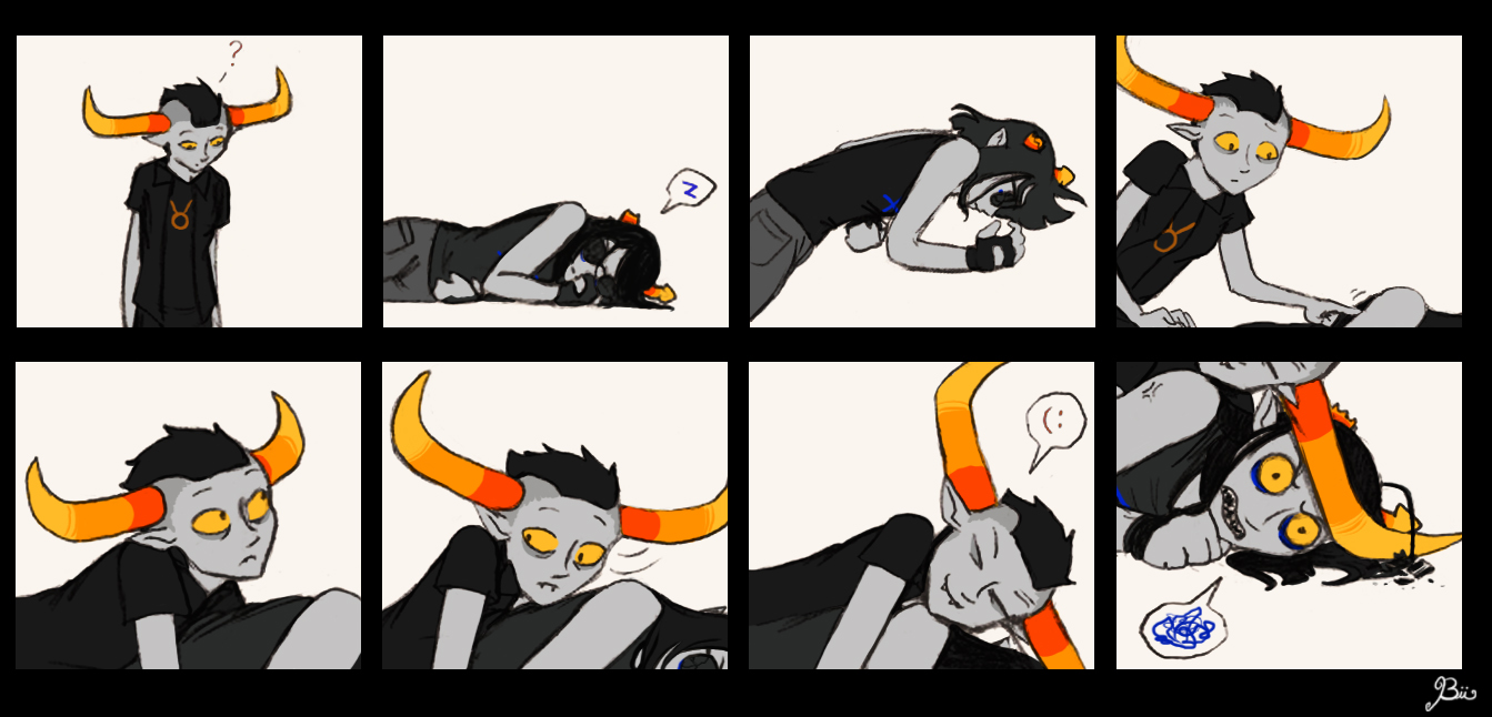 I am working on a fucking giant Sollux/Karkat comic. I think it might be 4 pages long in total (I'm on the third). I'm sketching this shit out ahead of time so I can ink it and be done before I can let myself get sick of it.I'm gonna try to finish it before this thread bumps off the first page, but I desperately need sleep so it is nap time.