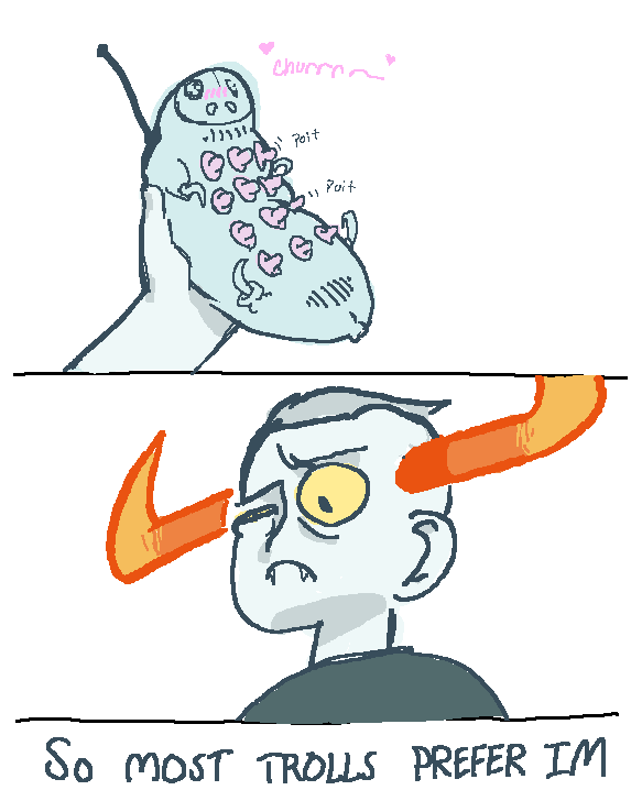 >>51765I honestly didn't! I dunno, Tavros isn't my favorite troll. I mean, he's cute and all, but he's too damn meek for me to imagine him being in any sort of non-friendship relationship :\