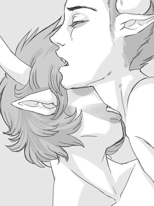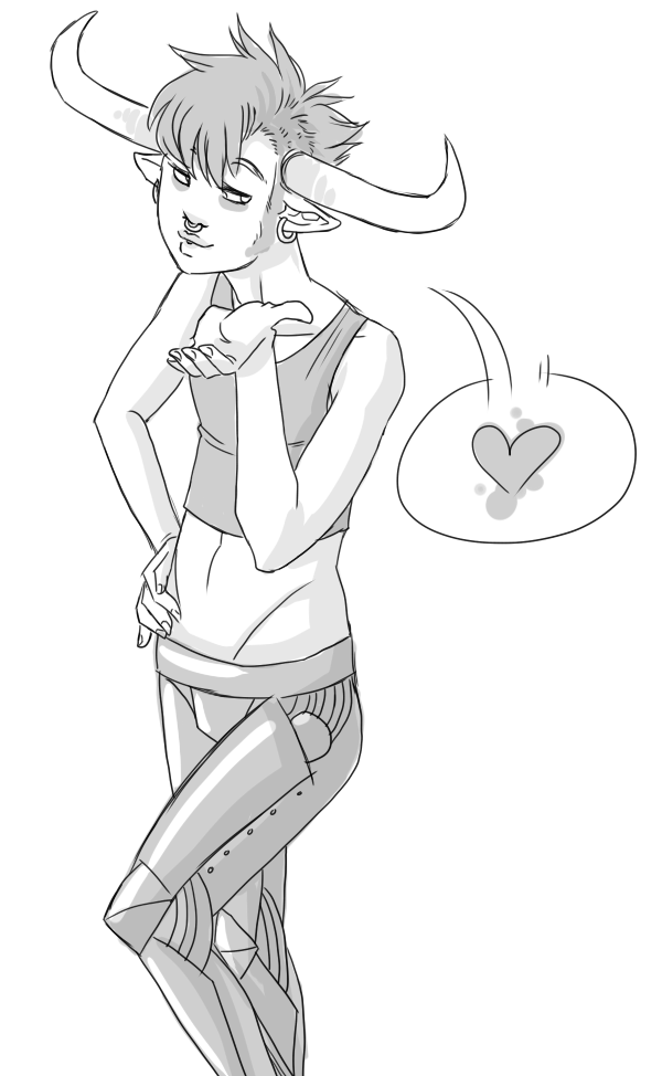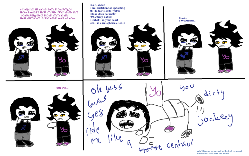 I don't really know what to think of Karkat. I don't really feel THAT bad for him, because he is a giant seething douchebag to everybody. That he places so much value on the color of his blood, as if he agrees with Equius that he is worthless because of it, sorta says to me that he's digging his own ditch, here. Maybe that's just the way he is, though. I mean, it's not like I think he deserves any of that, but he also isn't very proactive about doing something to make himself feel better.Tavros is just the brunt of all that could be considered bad luck. And he's still happy and likes everyone. Bad things (much worse than being grumpy all the time and having red blood) happen to him and it doesn't bother him at all. Broken in the head or not, I still feel worse for that kid.Enough rambling, though. Here, have a teeny kissing picture.