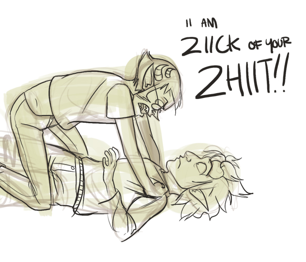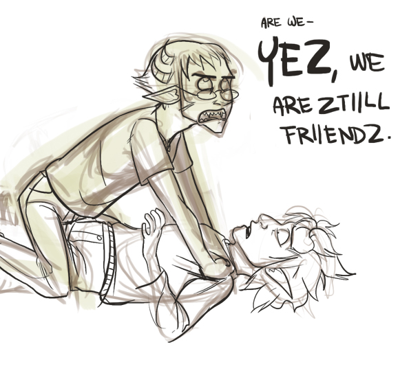 I am working on a fucking giant Sollux/Karkat comic. I think it might be 4 pages long in total (I'm on the third). I'm sketching this shit out ahead of time so I can ink it and be done before I can let myself get sick of it.I'm gonna try to finish it before this thread bumps off the first page, but I desperately need sleep so it is nap time.
