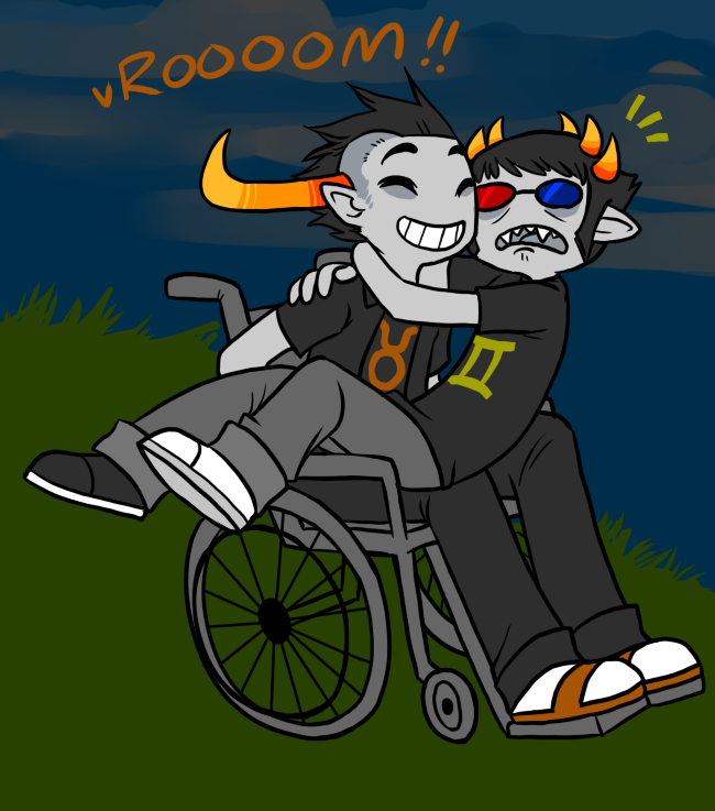 >>52020Sollux bolted down like lightning, hoping to get to the big-horned idiot in time--Tavros turned his head slightly, letting momentum carry him forward as he took a cautious glance behind him-- undoubtedly wondering who it was-- and Sollux saw his lips say his name without the lisp, and the look on Tav's face was incredulous.Had Sollux thought about it at all, he could've just used the same powers he was using to fly to stop the wheelchair and Tavros in place. In fact there were a lot of things he could've done instead of what he was doing, but he flew not to think but to forget about his troubles. So he didn't notice that Tavros wasn't headed for a cliff at all, but instead a very steep hill. And by the time he did, it was already too late. Sollux realized all at once that he was flying way too fast and without thinking let go of flight entirely, essentially throwing him right at Tavros.Tavros' face suddenly set with a wide-eyed expression and he grabbed the arms of his chair and pulled it up with him as best he could as he hopped into the air. Sollux yelped as he felt all of the momentum leave into strong hands, hands that had caught him in mid-air. He opened his eyes, not scarcely believing what he saw: Tavros had snatched him out of his trajectory, and he was now staring up at the wheelchair-bound boy from his lap, legs hanging over the side. Tavros simply looked down at him and grinned a gigantic, goofy grin, asking him something he couldn't hear against the wind."What?," Sollux asked in reply."I said, are you ready?""For what?"Tavros just grinned harder and closed his eyes as, to Sollux's utter horror, they barreled over the top of an incredibly steep hill and went rocketing down it. Sollux shrieked in abject terror and grappled at Tavros' neck for support as his legs went up in a half-hearted attempt to curl into a ball and be somewhere much safer and calmer than all this.Tavros just pumped the wheels as fast as he could, and above everything Sollux could hear him making a loud, ridiculous call: "VROOOOOOOOOM!"Sollux just stared at him blankly, his face frozen in complete shock. This can't even remotely be happening right now, he thought. It's not possible. But something inside him felt the same as when he was flying; that same feeling of his insides being pushed against himself with the sheer speed. It was that same exhilarating feeling, but he was experiencing it in a whole new and massively frightening way. And though he was never sure thereafter if it was a voice inside his head or Tavros in his ear, he heard something say: "Don't worry so much. It's all downhill from here."Sollux screamed and Tavros yelled and both went speeding down the hill with nothing at all on their minds.~~~At the bottom, Sollux rolled out of the other boy's lap with a massive exhale of breath that he hadn't known he was holding. At first all he could do was babble, and when he looked up at Tavros he saw that same confused expression return. He couldn't really answer him, not right now--Then, slowly, Tavros started to laugh.It started out soft, and Sollux's babbling petered out as the laughter went on. Tavros' cheeks were starting to color a light brown, the laughter only escalating, and Sollux found he was laughing to despite how scared he had been a moment ago, and soon both of their chests were aching with the sound.Beneath a clouded sky, the two friends laughed like that for some time.