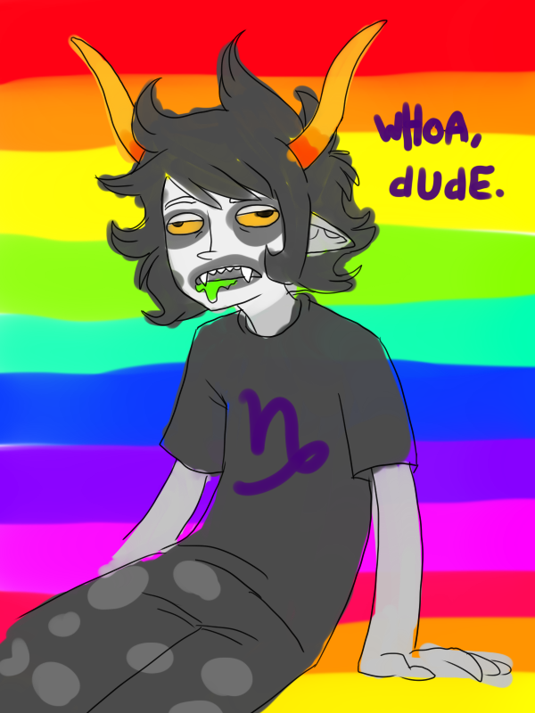 I can't be the only one who thought it looked like Karkat was fapping in that rainbow-blood thing right?I thought for a second he was...Jizzing rainbows...