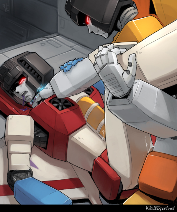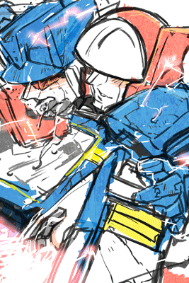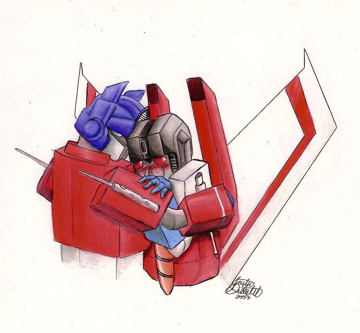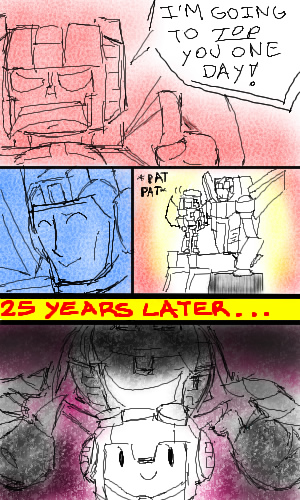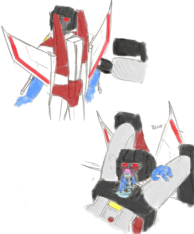 >>55781 Here's her summary;As for the rest of Choices.... Let's see. Where I left off, Skyfire (in the original universe) decided to keep the shard for a while longer and hurried off to the Autobot base to get his "condition" checked out. Eventually it would be revealed that Hoist could not find anything physically wrong with him, but that he would try searching Teletran's database for any similar cases. Skyfire ends up in the common room; someone (had not yet decided; probably Bluestreak, maybe Jazz) strikes up a conversation, and mentions along the way something they had heard about sparkmates: that, even though two people were not bonded, they were connected in such a way that they felt pain if the other was gone. The next chapter would have fast-forward to the next day with Thundercracker and Skywarp on space bridge guard duty. Skyfire arrives and agrees to help them find Starscream. They show him the space bridge and explain the problem, but say they can only let him investigate for as long as their shift runs. In time, Skywarp smuggles the datapad containing the bridge's blueprints along with Starscream's half-completed report on the bridge's damage before his disappearance. Eventually, Skyfire figures out a way that he believes will send Starscream back home--if someone is willing to go through the still-glitched space bridge and hand Starscream the equations and notes he drew up. (This actually takes a long time with a whole lot of back-and-forth, but that's the summary of it.)Back in the alternate universe, Starscream and Moonracer are making their escape from Autobot HQ. Actually, this is part of the plan Starscream and Skyfire concocted: a week ago, the Decepticons managed to steal an important data chip. I'm not sure what it does. Maybe it's for a weapon, or a way to produce energy. In any case, Starscream was to act as a sort of double agent and retrieve it. Skyfire did not let the others know about this plan until after he escaped, however; and of course by that point, everyone's saying he's a fool for believing the guy, but he insists Starscream will not betray them. He is too desperate to examine the space bridge.Time proves Skyfire right: Starscream returns not only with the stolen data chip, but a data pad full of information hacked from the Decepticon's main computer. There are still many who do not trust him, of course, but the upper chain of command at least believe that he will not betray them for as long as he needs to puzzle out the bridge.Skyfire, Starscream and Wheeljack head to earth, and they examine the bridge along with Perceptor and Autobot!Starscream (who is mostly there to ensure Starscream does not do anything rash). They gather some data, but nothing much comes of it; the sun sets and they return to HQ. There's some problem with lodging, since the only person willing to volunteer is Skyfire, but there is no way Starscream is staying in the same room with the guy. After some debate, who but Warp and TC let Starscream stay with them? Hilarity/awkwardness ensues.At some point, Original!Starscream gets to talking--probably to Skyfire, but maybe to the twins, or to Abot!Warp and TC, or even to his Autobot self. He talks about his own universe, his conflicting thoughts and feelings--how torn and bizarre he has felt since the accident that changed his spark. The constant pain he is wracked with, that remains except when he is around Skyfire. This bit of soul-searching will probably be brought up by a mix of the pain returning (even if being near Skyfire alleviates his pain, it's his Sky that his spark yearns for, not this AU version bonded to someone else), the confusion of being a true outcast in this strange universe he cannot seem to reconcile with, and just plain feeling tired. Whoever his listener is, they let him rant, and the reader gets to discover, along the way, a few more differences between the universes, such as Red Alert's bondmate Inferno being killed, after which Red went a little nuts: he blamed the Autobots and defected to the Decepticons. As a result, even if the Autobots have the upper hand in this universe, the Decepticons have good enough security that the Autobots have a difficult time penetrating their defenses.Later on they start off with calculations in the lab, and later head off to the bridge. When they do, though, they are ambushed by the Decepticons who are staying on Earth, who had been spying on them the day before. Starscream is captured and dragged off; the Megatron of this universe has something of an obsession with Autobot!Starscream thanks to an incident I have outlined in the timeline. It's not love; more like a hatred mixed with a kind of twisted fascination, and this strong but blurred sense that he should know Starscream, but some strange confusion of Fate diverged their paths. He does not want to kill Starscream, but rather wants to brainwash him/alter his memories/something so that he will become Megatron's air commander, "as he was always meant to be." Sounds crazy to everyone else, of course, but more of a creepy, horror-filmy moment for Original!Starscream and the readers. (Hopefully)A day or two after this, the space bridge suddenly turns on... and out steps Original!Thundercracker, Skyfire's datapad in hand. The Autobots rush over, but soon after his arrival, there's a problem: TC collapses, clutching his chassis as pain wracks through him. Autobot!TC also feels some reverberations of this pain, but not as much. Moments later, Original!Skywarp also steps through the bridge, and TC's suffering stops. Turns out, bondmates being is separate universes is almost as bad as one or the other dying. The only difference was that they could still feel a brittle string of their connection, but it was stretched thin over subspace and felt, at any moment, as if it might break.Here is where it gets fuzzy. There's a lot of confusion, but basically everyone has no choice but to accept there's an alternate reality and they have th