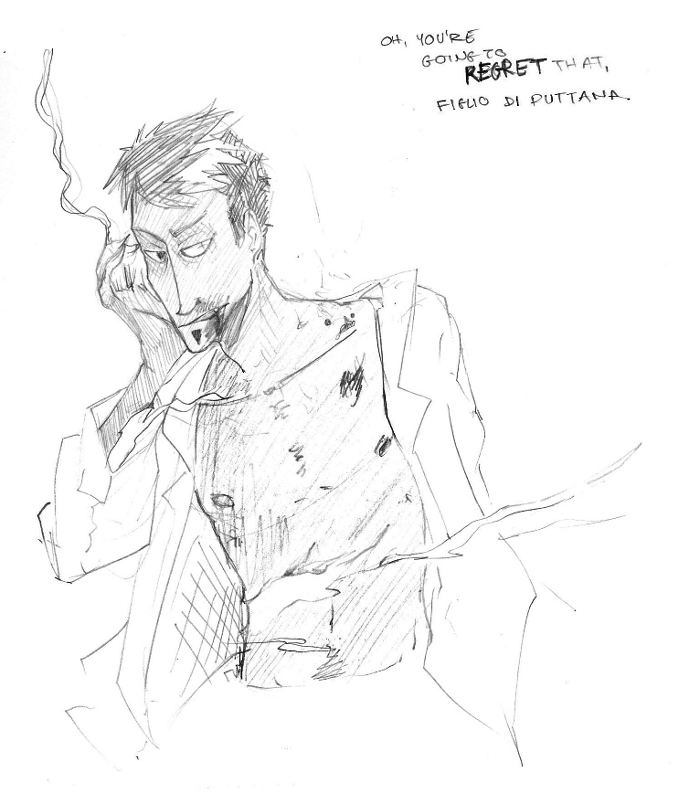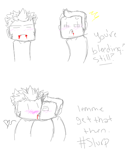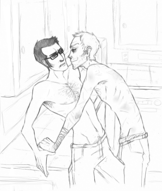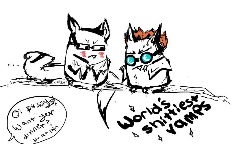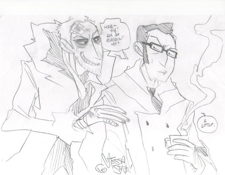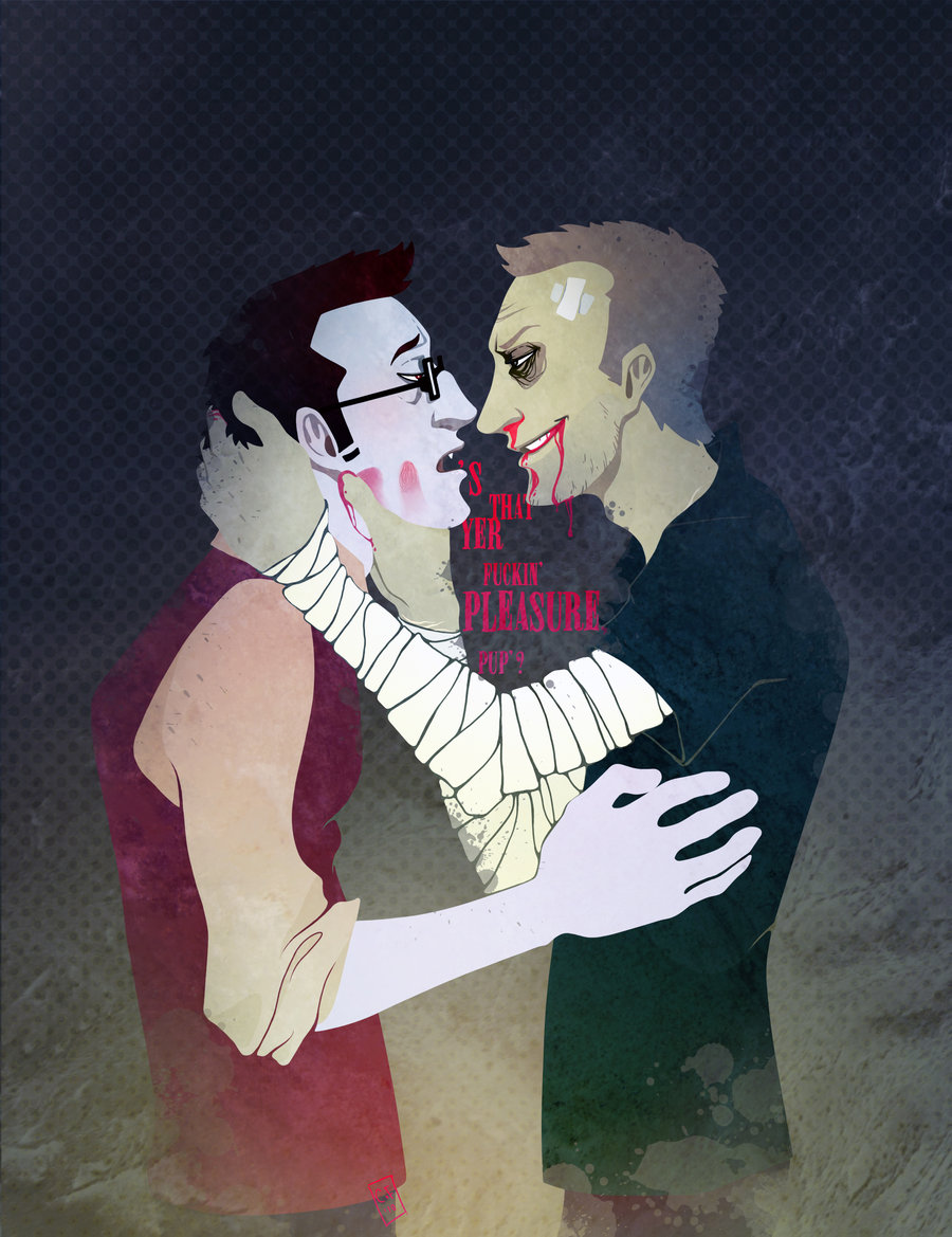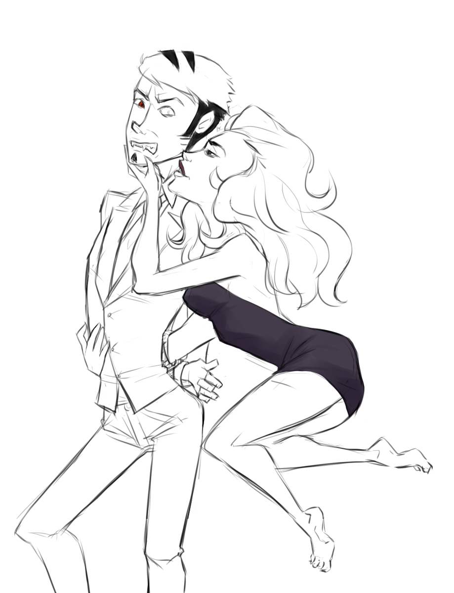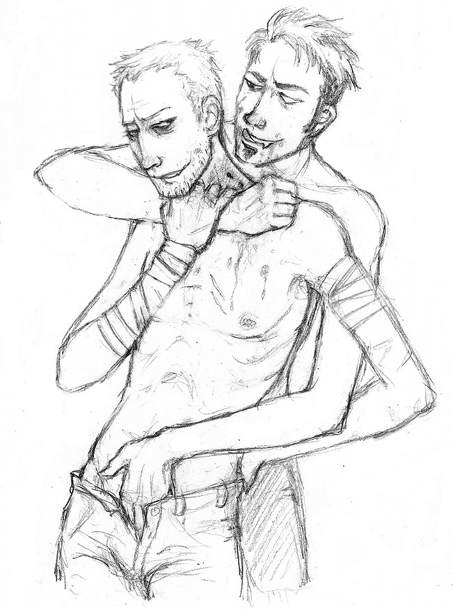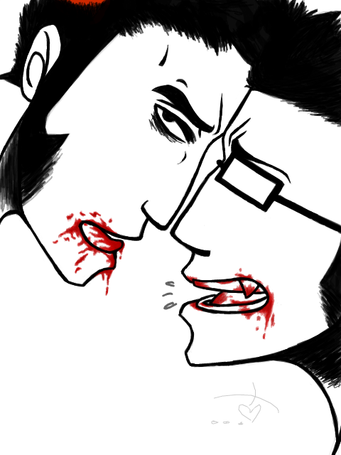 So I'm gonna do this thing that I do where I post what I've got so far which is NOT PORN YET in order to pressure myself to finish the porn quicker, kay? <3A pretty rare pairing as requested by the lovely Ziggy. Porny illustration also in the works. This episode: just some bitchy vampiric interaction and expo. Next episode: blood, pain, drugs, breathplay, etc. I promise. * * * *Part I (Conrad)Conrad had realized that he was being followed two blocks back. At first it was just a suspicious prickling sensation on the back of his neck, easily chalked up to his normal level of paranoia. Then, a more confirmative glimpse of a shadow slipping back into an alleyway set his jaw clenching and his pace quickening. Soft rustlings gave way to actual, honest-to-God footsteps after one block, and then it was all Conrad could do to keep himself from whirling around to look. It was harder still not to simply bolt towards the nearest dumpster and dive into it, praying all the while that whoever or whatever was stalking him would turn up its nose at such an audacious display of cowardice. Sure, running to a well-lit area might be a better choice, but he was on his way back from Worth's, so the “safe spaces to run to” count hadn't yet climbed beyond zero. He'd told himself to remain calm (yeah fucking right screeched his amygdala as it went about its routine panic) and to keep going---he couldn't be more than a few minutes from actual civilization.Finally, the shelter of a 24-hour diner gleamed neon salvation up ahead, and that was when he heard the cackling behind him. A chill raked up his spine---the laugh was oddly familiar. Giving in to equal parts terror and curiosity, Conrad turned, and was met by a pair of mismatched eyes and the glint of perfectly sharp teeth emerging from darkness. “Boo,” grinned Casimiro, and then his face contorted in another fit of laughter. Conrad stared wide-eyed for a moment, then his shoulders went slack and he rolled his eyes in exasperation. Even with the understanding that he most certainly was not yet safe, he couldn't help feeling the tiniest bit of relief to be facing an evil he knew. “You know, that really wasn't funny the first time,” he moaned. “No? Well, watching you trying not to piss your pants for the past ten minutes was fucking hilarious.” “Why the hell were you following me?” Conrad spat, trying not to let the sudden hot flush of embarrassment get up into his face. He had some of Worth's blood in him, though---not much, not enough, there'd been some words and he'd stormed out before they'd “finished”---but the little color it leant to his cheeks was now actively betraying him. He glanced around, and yes, there was a bulkier shadow further back---Finas, leaning against a burnt-out streetlamp. Wonderful. Conrad's night---which had quickly gone from bad to worse (from bad to Worth his brain echoed hollowly)---had finally plummeted to miserable. Fuck my life, Conrad sighed internally. Unlife. Whatever.“Ah, well, the night is young and there's always time for a little entertainment before a meal. Speaking of which...” Suddenly Casimiro was only inches away, leaning down slightly and...sniffing, oddly enough, at the air around the shorter man. Conrad froze, confused and panicked. After a moment Casimiro leaned back, eyes narrowed to slits. “Enjoy your dinner?”“W-what, what are you talking about, I don't know what you mean---” Conrad fumbled, shying away from the piercing red and white gaze. It wasn't unthinkable that the older vampire could smell Worth on him---after all, the “doctor” positively reeked of smoke and sweat and God knows what else---but Conrad was beginning to suspect that there were more than a few vampiric senses and abilities he was lacking.“I have to say I'm surprised,” Casimiro continued nonchalantly. “I mean, I figured you for a bagger as soon as I met you...but you've obviously been busy. Who is he? Smells like an addict.” That throaty, wolfish laugh again, and, “Now that's a shock. You don't look like a lush at all. Does he, Fin.” The other vampire, who had somehow crossed the empty street in the time it took Conrad to blink, said nothing. His mouth, however, was a thin line of annoyance, and he was looking at Casimiro with impatience. If the taller man noticed, he ignored it---it was plain to see that Casimiro was in no hurry at all. “Look like a what?” Conrad blinked. It was Casimiro's turn for a dramatic eye-roll. “Oh, I'm sorry, sometimes I forget that you were sired yesterday, and by accident, and by that ridiculous bitch whore of a---”“Casimiro,” came the low rumble from Finas. There was an acid glance between them, and then Casimiro looked back and smiled the most unconvincing and unnerving smile Conrad had ever seen. “Right. A lush,” he drawled, slowly as one might talk to a child, “is a vampire who enjoys drinking...from someone who enjoys drinking. Or pills. Or anything else that gets you up, down, or sideways.” He flashed his fangs in a wicked grin that clearly signaled his own preference for drugged blood. Conrad did not want to have that in common, didn't want to have anything in common with the semi-psychotic figure in front of him, and it wasn't really as though he preferred it when Worth had been drinking or doing whatever else got him (and then Conrad by proxy) all hazy and warm, and the first time it happened Conrad hadn't even known what was going on so he clearly wasn't looking for it and he was not a lush and---- A quick snap of Casimiro's long tan fingers right in front of his face brought him back to reality. Conrad turned away, more flustered than ever. The diner was so close, surely they wouldn't follow him in, maybe if he could just make a dash for it...“Right, well, thanks for the...educational moment, and I really do have to be going now so I'll just---”A firm hand on his shoulder stopped his feet before they even registered the signal to m