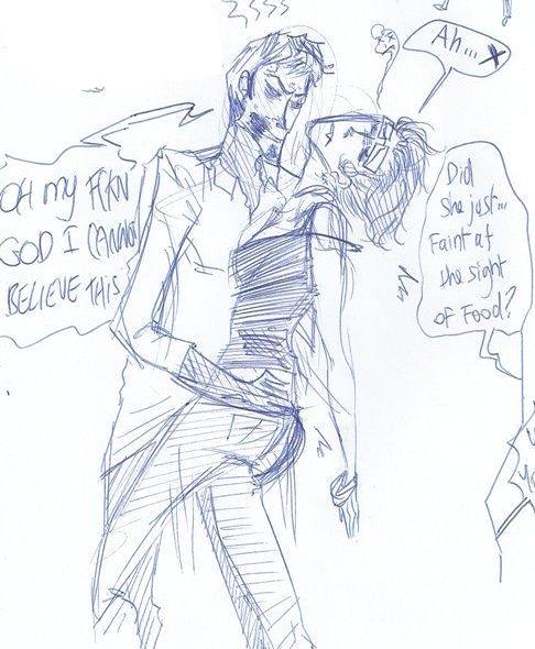 Back with moar AU pt I: http://duckyqueen.deviantart.com/gallery/#/d2uazubpt II: http://duckyqueen.deviantart.com/gallery/#/d2ujhbdpt III: http://duckyqueen.deviantart.com/gallery/#/d2uwx4x+++Hanna sleeps through his alarm. And then his second and third alarm. Wes simply sits and watches the red head sleep. At one point, he gets up and scrolls through Hanna ancient cell phone to find his manager's number and tell him that Hanna can't come into work today. No, Hanna isn't dead. Yes, he should be in by Thursday, he'll call you later, thank you. Around noon, Hanna bolts up, rushes to the bathroom. Wes can hear him peeing, brushing his teeth. He hears the water run for a moment and then a split second of silence and then he hears a thud. A low laugh. "Jeez..." Wes hurries into the bathroom. Hanna, in his boxers and T-shirt, is sprawled on the floor. "Fuck..." Wes pulls Hanna up and into the kitchen. He sits the young man at the table, where he sways slightly and giggles. "Nathan..." Hanna says, dazedly. Nathan turns away from the fridge (which holds a depressingly small selection of food). "Why... are my fingers moving?" Nathan sees the slight tremor in the boy's hand and feels the thing in his chest twinge. "Oh Hanna..." He rises and presses the small hand in between his own. "You haven't eaten. What should I make you?" Hanna shrugs and his skin seems to twitch. "Cereal? Tea?" Hanna laughs. "I once... made somebody tea," Nathan pulls away and fills a pot with water and sets it on the stove. He finds a bowl and pours some cornflakes and milk into it and sets it down in front of Hanna. Turning back to the cupboard, he finds a relatively clean mug and a tea bag. He hears the spoon clinking around in the bowl. A few muffled crunches of Hanna chewing. "Hanna, do you want sugar in your tea?" Nathan asks, facing the redhead. He stops. Hanna has something pinched between his thumb and forefinger. It's tiny, maybe as long as a grain of uncooked rice. "Hanna?" The boy tilts his head, examining whatever is pinched between his fingers. "It's a Mealworm," Hanna says. "They turn into beetles. I think." There is silence for a moment. "They live in cereal boxes... for the grain..." He opens his mouth. Drops the small thing in. Swallows. Nathan closes his eyes and opens them again. Hanna is staring at him. "Hanna, why did you do that?" Hanna looks down at the bowl. Back at Nathan. "I..." Hanna looks lost. Small. The water is boiling.~ Nathan puts Hanna to bed shortly after the Mealworm incident and sits close to the bed. He reads his book, occasionally glancing over to Hanna. The incident didn't <i>bother</i> him. In the sense that it didn't make him think <i>less</i> of Hanna. He remembers the way Hanna looked after swallowing the tiny creature. He feels... sad? He can't place the emotion. He wants to hold Hanna. He wants Hanna to eat. He wants Hanna to be safe. Hanna sleeps until about seven pm. When he sits up and pushes on his glasses, his eyes are clearer. "Hey," he says softly. Nathan makes no move to turn the lights on. He examines Hanna in the blue twilight of the room. He decides that Hanna probably doesn't remember the incident. "We have a new client."~ They meet the girl, Toni Ipres, in the theater at nine o'clock (after meeting Conrad at a bar, because the young man didn't really want to be alone at night after the incident with the other vampires). The theater had probably <i>once</i> been nice. The cushions on the seats are ripped and stained and the air feels damp and moldy. Toni and her band clash with the space. After putting her bass down, she hops off the stage and introduces herself, her ponytail bobbing with almost palpable excitement. She mistakes Nathan for Hanna, shaking his hand with vigor. "I'm not Hanna," Nathan says, politely. Toni turns to Conrad who shakes his head, with his hands up in a "don't look at me" kind of gesture. Instead of asking Hanna all sorts of questions pertaining to his age, she simply grins apologetically and shakes his hand. "I'm sorry Mr. Cross. I'm Toni," Hanna just shrugs. "I get that a lot," he mumbles. Toni smiles. "We," she gestures with a tilt of her head to the group of people on the stage. "Are so glad you could come. And also that you got the message, that doctor guy..." She trails off. Nathan knows what she means, but Hanna just peers at her, his head tilted. "So, what has the ghost been doing?" Hanna already has his Sharpie out and moves towards the stage. "Has anyone been hurt?" Toni, Conrad and Nathan follow Hanna, who pulls himself onto the stage. "Uh, no," Toni says and climbs onto the stage after Hanna. He motions for Conrad and Nathan to follow. "And what usually sets the ghost off?" Hanna switches his sharpie for a large, silver paint pen. He begins to shake the marker. "When we start playing..." Toni watches Hanna begin to draw a large circle around the band and the equipment. "Uh, not to sound <i>rude</i> or anything... but what are you doing?" Hanna finishes the circle and stands up, pushing Nathan and Conrad inside the circle and stepping in himself. "Magic circle," Hanna says, pulling a hammer out of one of his belt loops and scrawling something on it with the marker. "For protection..." he says this, while scanning the dark ceiling. "No one steps out of the circle." Everyone nods. "Alright, start playing." The band isn'tt horrible, Nathan notes, but the lead singer makes him cringe. She sings with the confidence of someone who sang well, but her notes were flat and strained. Conrad looks on edge, his hands clenched. Hanna continues to scan the theater, his hands shaking. As the band is reaching the bridge of the first song, the lights went out. The band slows their playing, but Hanna takes no mind to it and steps on the circle, which begins to pulse with faint light. An unearthly shriek suddenly rings through the building. The band stops completely. Hanna steps outside the circle. Nathan wants to grab Hanna, but finds his feet stuck 