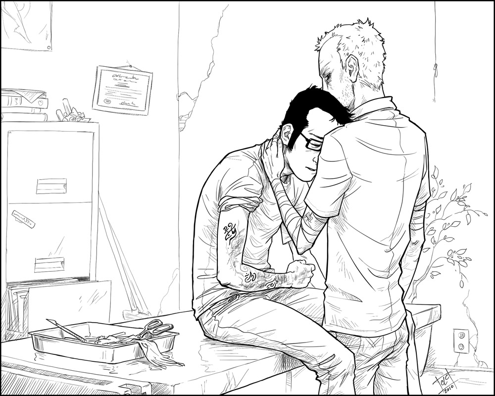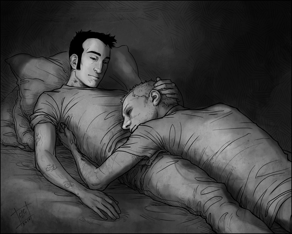 Making the Same Mistakes AgainOnce again, words by Spook and art by Caco.-It's been 18 years since the last time he had a broken bone- memorable, because it was also the last time his mother had let him go to Jacob Newley's house, which meant he was the only kid in class to miss out on that summer's one and only pool party. He'd cried at the hospital, but not too much, because he could already tell his mom was mad and he wanted to be good so she wouldn't yell at him for climbing trees in the first place. The doctor had been really nice, though. She'd brought him a pudding from the cafeteria.He thinks, now, that he's probably in shock, which is why his mind's wandering like this. There's a lot of pain, but it's almost distant, and mostly he just feels cold. Which is kind of weird, because even though he knows he is cold, he doesn't actually feel it anymore. Not like this, anyway, like a chill all the way through him. He has a vague moment of wishing Worth was nearby (Worth's like a goddamn human radiator) then he realizes Hanna's Zombie Sidekick is trying to say something to him.Changing back into a bat doesn't sound so great- it sounds like work, quite frankly- but being carried sounds good. He's not really sure his legs are going to hold out too much longer; he'd probably be feeling faint except doesn't that come from a loss of blood to the brain or something? Well, actually in that case he's probably more likely to faint, but- right. Bat-shape. Right.The trip to Worth's is a blur; the change seems to make his arm (wing) hurt worse, or maybe it just clears his head enough for him to feel it, but either way all he can think is pain, pain, pain, sharp stabbing pain that puts a haze over his eyes and makes him see stars with every jostle to his right side. He only knows they've reached Worth's because he happens to catch the familiar scent as he's gasping for breath he doesn't actually need.When he tries to sit up, his wing gets jarred in a way that makes his vision white out completely for a minute. It's possible he makes some embarrassing noises; it's kinda likely that he falls over. He's not really sure, though. The next thing he's aware of is being set on the table, and Worth hovering over him.It takes a minute for Worth's words to sink in: change back again. Right. That sounds like a completely fucking awful idea, but maybe it means he'll stop hurting soon. Or maybe this'll be bad enough that he'll actually pass out, which would actually be pretty welcome right now.He doesn't pass out, but he does nearly fall; he's kind of too busy gasping in pain to care about how embarrassing that would've been. The shift makes his arm feel like it's full of stabbing things, and he's a little afraid that those stabbing things are bits of his own bones, and he's really not willing to look at his arm right now to find out. He whimpers to himself instead, closes his eyes, tries to ignore the way Worth is jabbing at him and snapping at Hanna and just generally being an asshole. The familiarity of it is almost comforting, really.The hit of the first rune to his arm is like ice water being poured down his spine, only in a good way. It makes the pain sort of blur, and the second rune seems to be more of the same. "Oh," he murmurs softly, relieved, barely more than an exhale, and Worth's fingers brush his hip in a way that could almost pass for accidental. He has no idea what the next rune does, but at least it doesn't hurt, and then Worth's doing something weird that he decides to just ignore in favor of basking in the snow-cold numbness keeping the pain away."Next time you get it into your head to run off like a moron," Worth's saying, snapping at Hanna, sounding genuinely annoyed, "bring the werewolf instead. At least she ain't completely fuckin' useless."Ugh, just when he'd started feeling benevolent and almost-fond towards Worth for whatever the hell he's doing to his arm. "Fuck off," he mumbles, and Worth answers him somehow- words words words, it's all sort of fuzzy. Worth's being a jerk, though, he can follow that much. And he's aware Worth's moved on to messing with his hand, because it's a little less numb than his arm, and then it isn't numb at all because ow and fuck.He realizes he's making really pathetic noises, makes himself stop. Fuck, his hand fucking hurts and somehow that thought makes it through the cotton cloud around his brain and flips the panic switch. "I- my hands," he says, or slurs, or babbles; he doesn't think he's making too much sense right now but apparently enough of it gets through."Hold still," Worth snaps at him, and says some more stuff, too, and somewhere in there is reassurance and even if the words don't get through his tone does, and Conrad feels the tension slide out of his shoulders pretty much immediately. He's sort of surprised to realize how readily he's willing to take Worth's word that he'll be okay.The pain fades back again a bit, enough for Worth's actual words to register, and the implications that go along with them- his drawing hand, he'd said. Ha. So Worth's been paying attention; the sudden warm feeling in his chest might have something to do with the affection thing that they don't talk about, but he's sure it can just as easily be blamed on the runes somehow, or maybe the pain.Still, Worth's hands are surprisingly gentle where they're running over his arms, and it almost gets a smile out of him. The affection thing (that they don't talk about, ever, seriously) is apparently mutual.Whatever Worth's doing is helping, though; after a minute the numbness starts to turn to warmth, radiating out from his arm to all along his right side. It's such a fucking relief that it makes him sigh a little, slouching forward a bit to press his forehead to Worth's shoulder. Worth's ridiculously bony shoulder, ow, but even that's kind of okay because Worth reaches up, touching the back of his neck, ruffling his hair a little.He closes his eyes, still for a moment, feeling