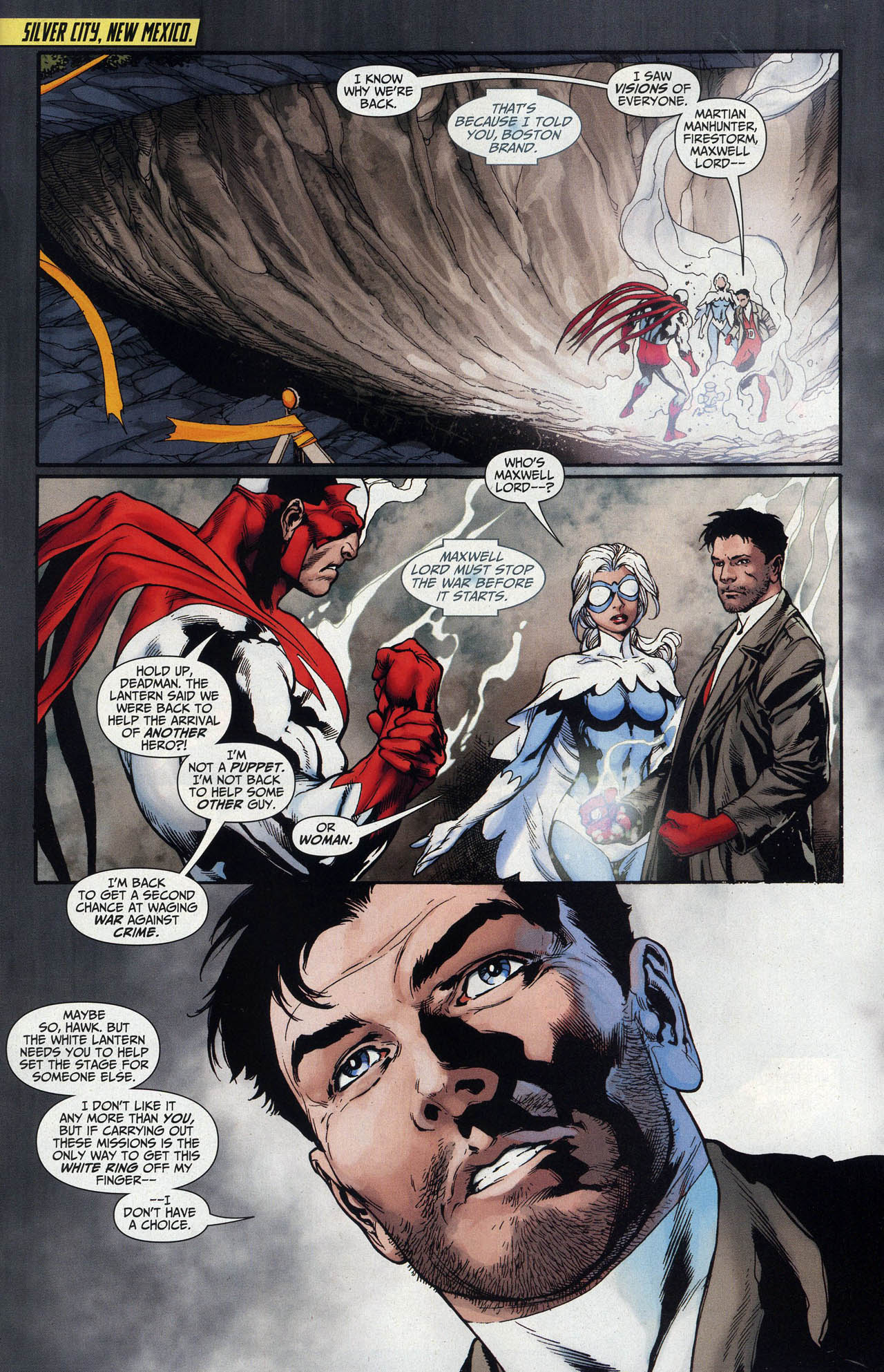 Also, when the entity hands out the missions, Hawkman, Hawkgirl, Boomerang and Max's symbols were in black while everyone else's were white. Foreshadowing?Max dying is only acceptable if Ted comes back in his place.Also, when Max transforms into a White Lantern in JL:GL #7, his guns disappear. THE ENTITY WANTS YOU TO STOP SHOOTING PEOPLE, MAX.
