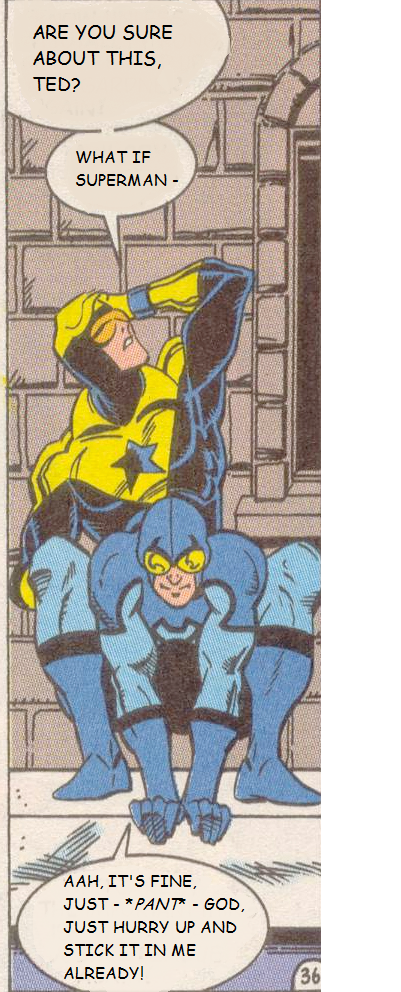 i've got intentions on writing when this hangover subsides, but in the meantime, booster being a lightweight at some kind of justice league get-together."Ted - Ted. Beetle-buddy. I love you, man. I mean it.""Booster, you're killing me here.""Whaddayamean?""I mean I've been trying to get Power Girl's number for the past twenty minutes.""And?""And now she looks like she's about to burst out laughing."