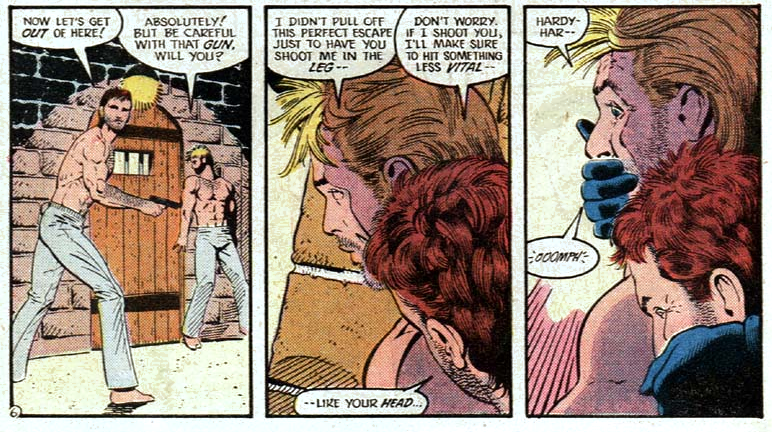 - Also MORE DADDY BOOSTER. In a leather jacket even. And baby!Rip being adorable.-Iron talking bird! One of the more flattering things Skeets has been called, I reckon.- That pic of Rip kicking the guy is a bit awkward. How long is his leg there? Actually, all their legs look a bit thin compared to the chests, must be the artist.- Timestream dumps Rip into places where he's supposed to stick his nose into things, I guess.