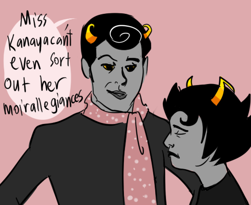 Man I am just waiting with NO PATIENCE AT ALL for more character details, because frankly this guy doesn't strike me as hard as Equius did originally-- though admittedly the facets of his personality currently come through as "gay nerdy trendy seahorse riding aristocrat with mad-scientist style and a SCARF". So I am just waiting for those details and then I'll probably write something. Argh, the backlog of ideas I've got for fic is piling up damn you real life.
