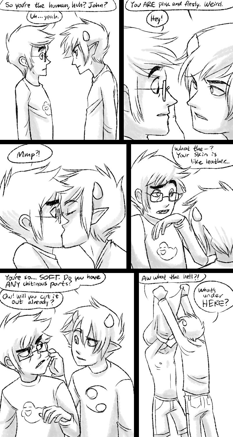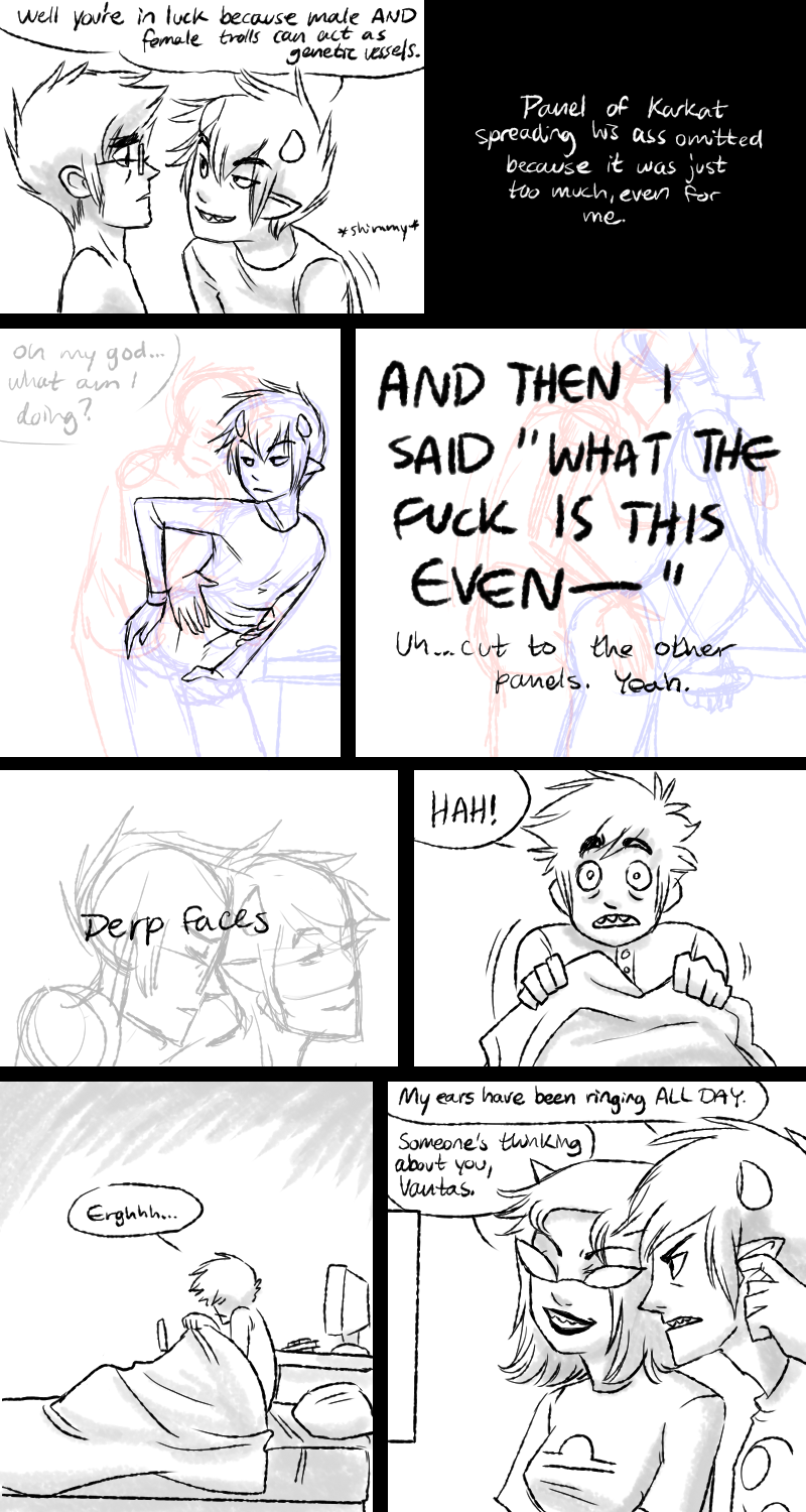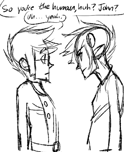 I've got two pages of the Karkat/John comic sketched and the third is just... I don't know how seriously I intended to take this when I started out but god damn. Also I think I might pass out but I really want to get this done. Sorry if it appears rushed and just basically god-awful but sleep. She beckons.