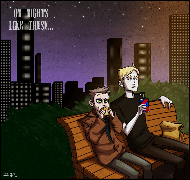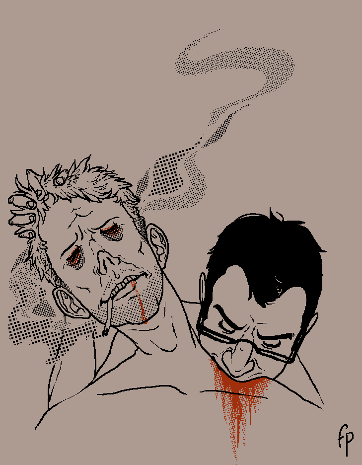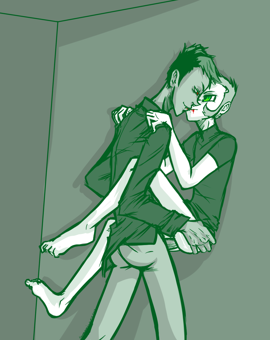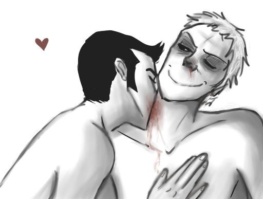 Guhhh, time to stop agonizing over this and fucking post it already. Long, and not (yet) containing porn but bringing us right up to where it will obviously happen. AND IT WILL HAPPEN even if I am slow as holy fuckContains: drinkin', fightin', and a gay unicorn joke. Continued from >>52656* * * *Part II: WorthThe fluorescent light flickered and buzzed overhead, somehow managing to make the tiny bathroom feel even more claustrophobic---as if the walls moved in during those split-seconds of darkness and jumped back as soon as the light returned. Worth held his hands under the rusty faucet, caught the icy water in his palms and brought it up to his face. He glanced up to the mirror and was transfixed for a moment by the way the droplets ran down his gaunt cheeks. He cocked his head to the side to alter their courses, following their individual paths for a moment before losing interest and straightening up.Fuck this, he thought bitterly. It was time for a drink---no sense in letting the night go to waste moping about like prissy little One-Fanged Wonder. It had been half an hour since Conrad had slammed the door to Worth's office behind him, leaving the doctor still leaning against his desk with a little blood drying on his wrist and a raging hard-on completely neglected in his pants. Ah well. It was a thin line he walked with the vampire----push just enough and Conrad would give him everything he wanted. Push too hard, even a hair over the edge, and he'd be gone.Worth was pretty sure he'd been getting better at it lately, but apparently tonight he'd tripped up. Figured that it would have been something about Conrad's mother that would set him off. He could barely even remember what he'd said, only that Conrad had pulled back in shock and stared at him for a few seconds before delivering a (delightfully hard) punch to Worth's gut, shouting something at him and turning tail. Frustrated, Worth had sat on his desk for a few minutes staring at the back of his office door, then heaved a sigh and lit up a cigarette. He'd wrapped the bloody bite mark up in a fresh bandage and then sat down to try to get a little work done, but Connie running off in the middle of what was quite probably (according to his dick, anyway) gearing up to be great sex had put him in a foul mood, and he was having more than the usual amount of trouble concentrating. He flicked the light off in the bathroom and stepped out into the hallway adjoining his front office, then took a left into the back room where he kept most of his things and the dirty old mattress he slept on. The “medicine” cabinet was running a little low---he'd have to talk to Monty about that. There was nothing---from hospital supplies to arcane herbs to hard liquor---that that man did not traffic in. Everything had its price, of course, but Lamont wasn't a hard man to bargain with. Turning the key in the lock (some things were worth protecting), he surveyed his collection, eyes finally landing on a bottle of Jack Daniels that looked three quarters empty already. It'd do---just something to warm his belly and take the edge off the mixture of annoyance and arousal he still felt. Goddamn undead yuppie. Six or seven shots later, Worth leaned his head back against the wall behind his desk, chair tipped back precariously on two legs and feet propped up on a pile of papers. Ash drifted down to the floor from the cigarette dangling between bony, nicotine-stained fingers. He let his eyes fall shut, relishing the warm glow, and wondered idly what Conrad was doing.Oh, mother'a Christ, his thoughts derailed in annoyance. What the fuck was he still thinking about him for? Ridiculous. Bloody fuckin' ridiculous, what that is. He let the chair fall forwards with a thud and reached for the bottle, only to find it empty save for a few dregs. He squinted angrily at it for a moment and then tipped its meager contents down his throat. With one last derisive glare at the empty vessel, Worth pitched the thing across the room, and the sound of it shattering against a filing cabinet brought only the ghost of a smile to his lips. Before he had time to wonder whether or not he should try another bottle, there was a faint knock at the door. Worth quirked an eyebrow---apparently he wasn't the only one still musing over the night's earlier episode. Maybe Conrad could be persuaded to pick up where they'd left off, or maybe the vampire had just come back to shout at him some more. Even the latter was preferable to boredom.Worth stood up (feeling the ground shift and sway only a little beneath him---after all these years, damn him if he couldn't hold his whiskey) and made his way around to the front of his desk. “Door's open,” he called out gruffly, flicking open his lighter and pulling another cigarette out of the pack in the front pocket of his coat. The office door swung wide. The vampire who came through it---and there was no doubt in Worth's mind that he was a vampire---was a stranger. Tall and dark-skinned, dressed in a stylish brown blazer and black slacks, his lanky form seemed almost to vibrate with restless energy. He cocked his head to the side and smiled, all teeth and confidence, and Worth felt something in the pit of his stomach turn over. Whiny, repressed art-fag vampires he could handle. This, on the other hand, was something he did not want in his office, or anywhere near his person. He took a long drag of the cigarette and straightened up a little, eyes narrowing in suspicion. “Help you with somethin'?”“Hope so, Doc,” the vampire grinned, red and white eyes (the fuck's wrong with the left one?) sizing up the other man. A pause, and then, “Right, manners, of course. Name's Casimiro.” He extended a hand, which Worth reluctantly took---the casual strength with which the vampire gripped and shook his hand made his stomach flip back over again. “Enchanted,” the doctor muttered absent-mindedly. He could swear he'd heard the name somewhere, but he'd prob