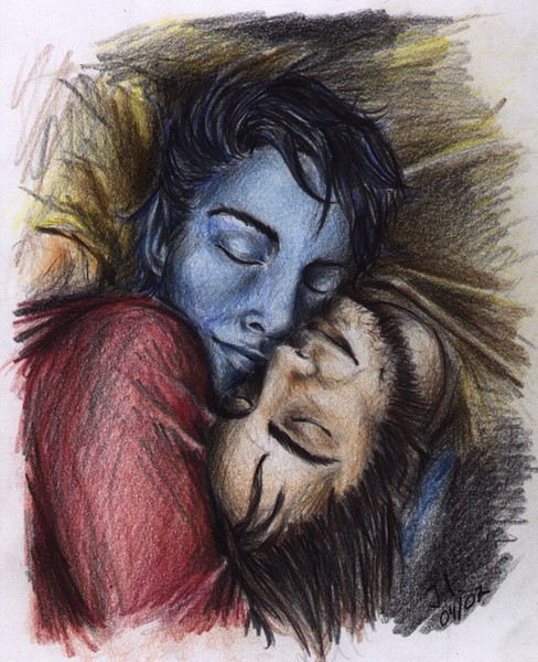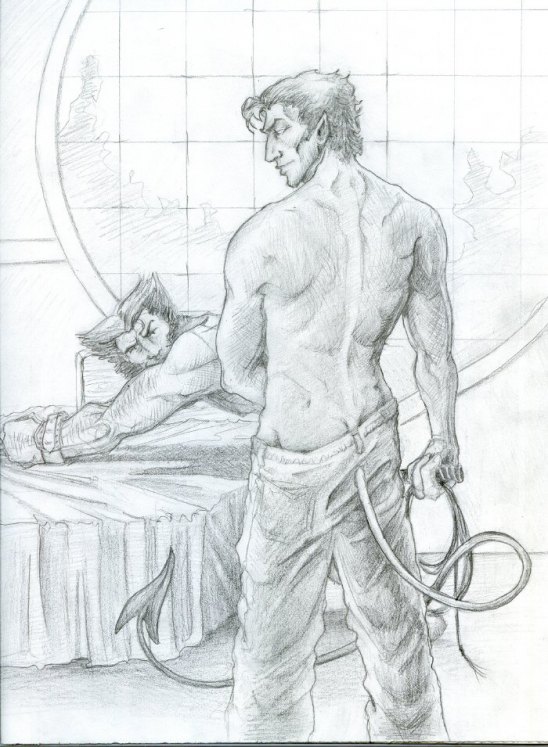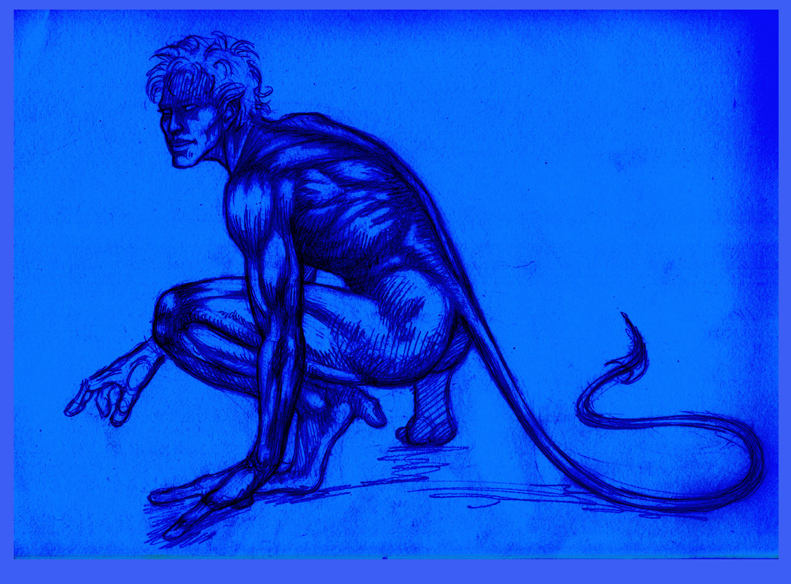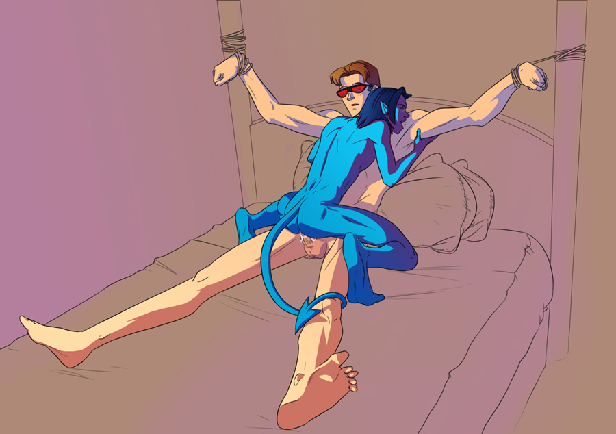 not much but... uhhere.------------------------------------------Muscular thighs tightened when that spade-tipped tail stroked against them, the owner making a small, strangled sound into the mouth of his attacker. Todd's head tipped back and he surrendered his neck to the other's biting. Sharp fangs clicked against one another and Kurt's black lips vibrated against his pulse with a growl. Those lips parting to allow a slick, too pink tongue to trace the throb of his heartbeat so obvious in the rise of his throbbing pulse. The taller boy's lips pressed hard to the side of Todd's neck, then parted and allowed him to continue licking and sucking all along the skin there. His tail lashed petulantly behind him and his breath came out hot and fast from flared nostrils. He growled again, and this time Todd whined throatily in response. That was all he could manage, the seldom molested teen wasn't exactly used to that kind of attention, especially from the mutant he loved to tended to fight one on one with the most. It was almost as if his enjoyment of tormenting the other had somehow been his intense attraction to the other manifesting itself poorly, like a mean pre-teen on the playground, always pulling one pretty girl's hair simply because he liked her. His heart raced when Kurt closed the gap between them, pressing his thinner, but much more obviously trained torso against the slumping form of his own body. He inhaled sharply, a strange fingered hand making purchase on his stomach of all places. He swallowed back another groan when they traveled south and fisted almost painfully in the crotch of his dirty jeans, catching his already hard dick in the process. "GAH! Nah' so hard, man!" He managed to squeak out, eyes closed, cheeks flushed with fresh embarrassment. Kurt only smirked toothily and mumbled something in german at him that could only be some sort of snotty insult. He felt his face get hot. "Fuck you, Fuzzy!" Todd stiffened against the other, ready for a fight. But the fight never came. Kurt snapped at his nose and smirked harder. "Fuck me? Hmm?" He gave a brief, serious JIGGLE of his fist that was still at his groin. "Fuck me, is that what ju vant?" Todd's mouth gaped at him... he was so challenging, he couldn't stand it. He bowed his arms and lifted to the other, chest out, breathing against black, pursed lips. "Yeah, I wanna fuck yah, thats wat I fuckin' said."
