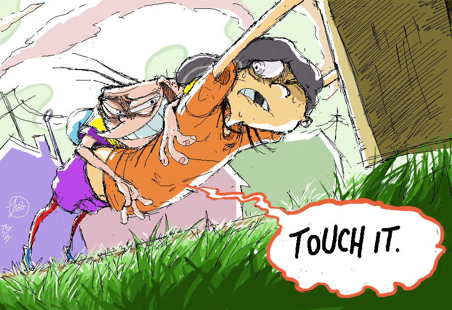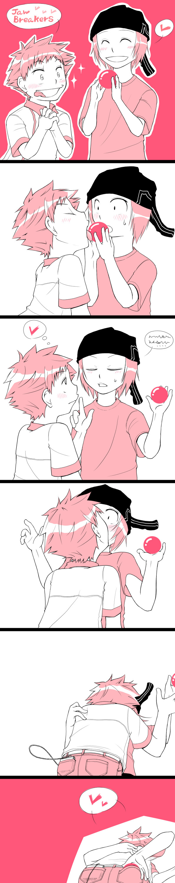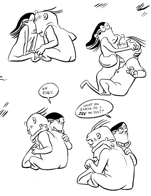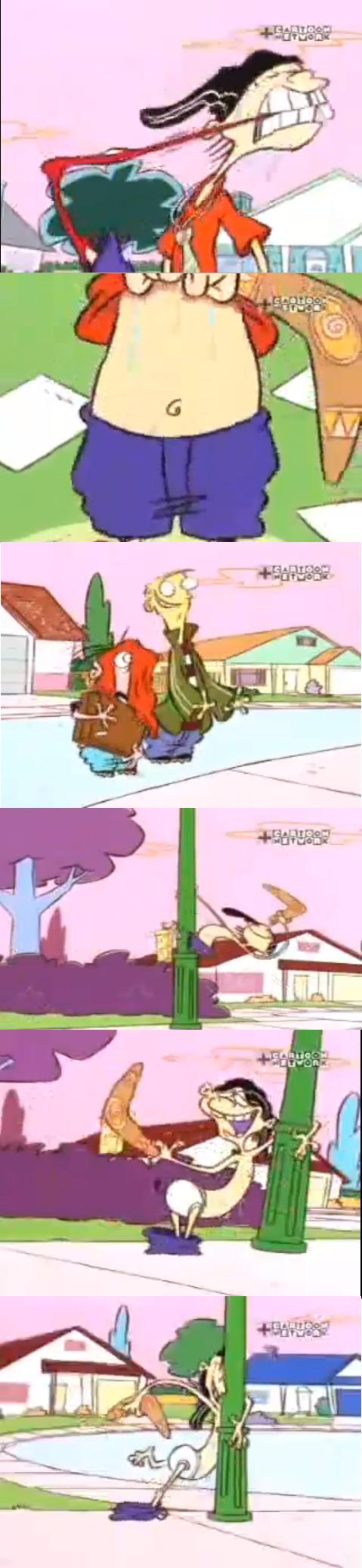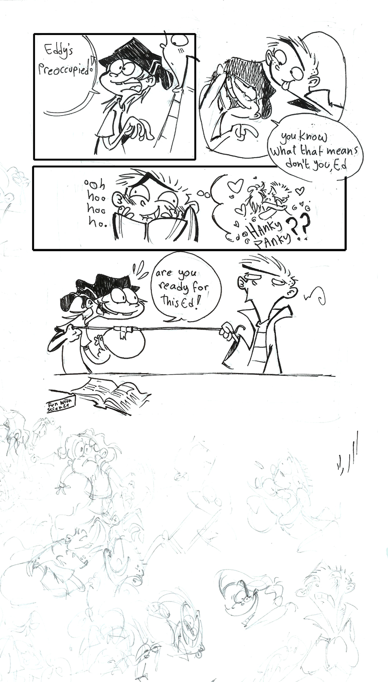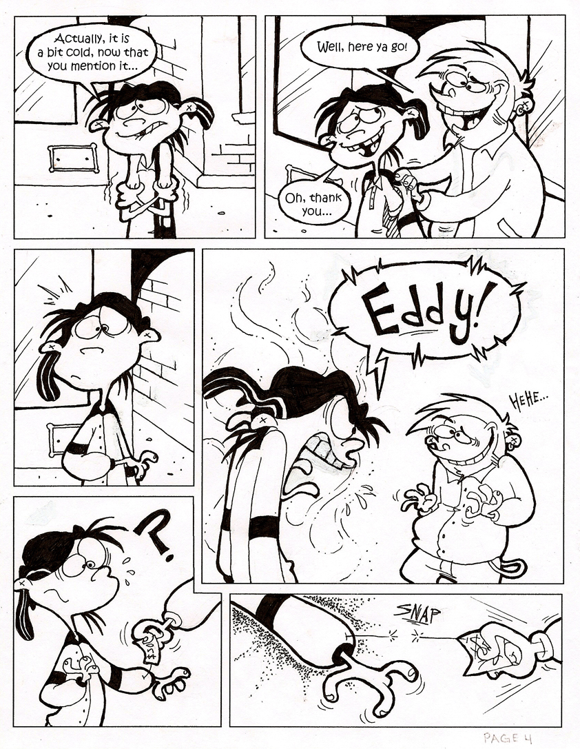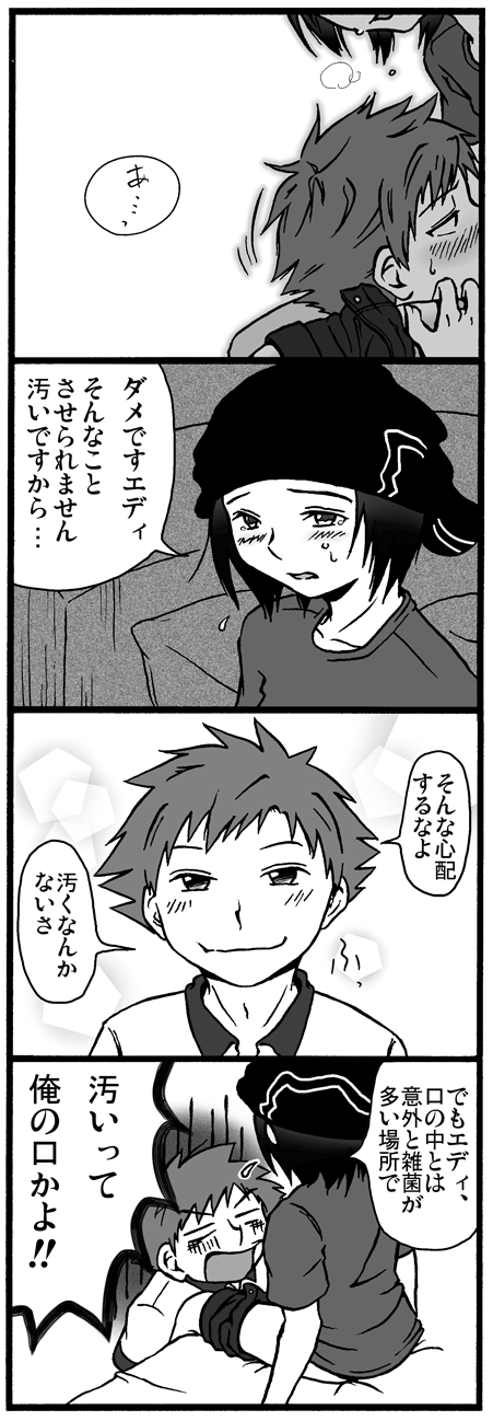 1 - Edd: Ah--!2 - Edd: Stop this, Eddy. Please don't make me do these kinds of things... It's so filthy...3 - Eddy: Hey, quit your worryin'! Ain't nothing filthy about it.4 - Edd: But Eddy! The mouth is actually a breeding ground for scores of pathogenic micro-organisms--Eddy: Oh, so my mouth's filthy, is that it?!