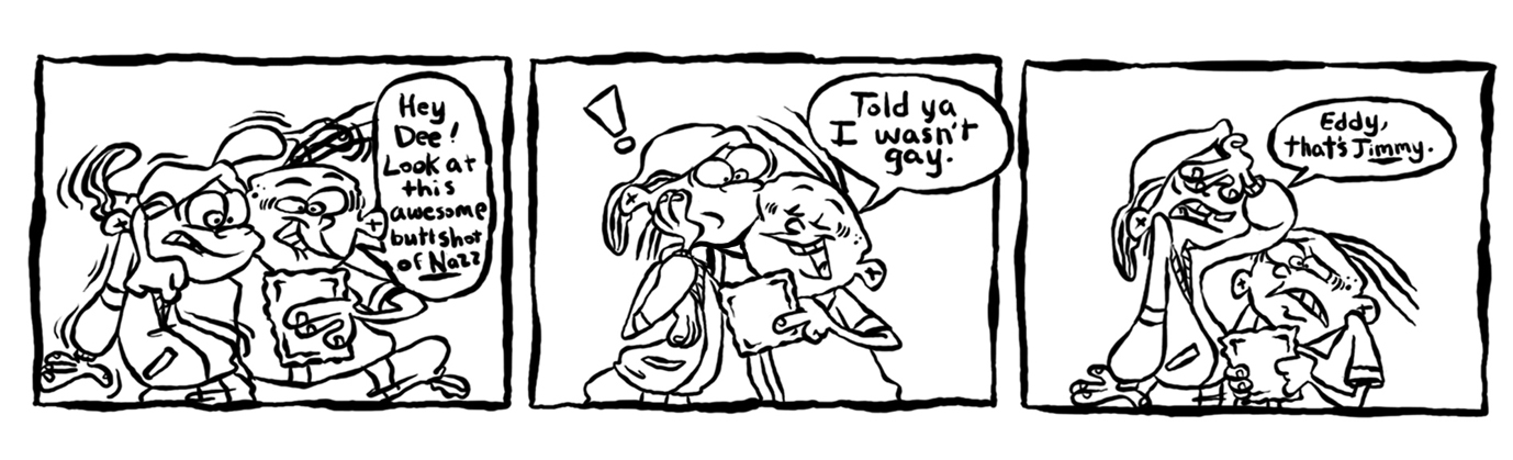 Thread needs more fic. C'mon, writefags.Oh, and I would lol forever at a fic where Eddy's brother hits on Double D under the impression he's a girl (remember the movie? "Why's your girlfriend got a sock on her head?")