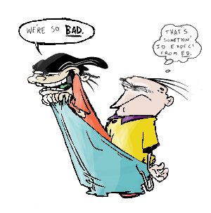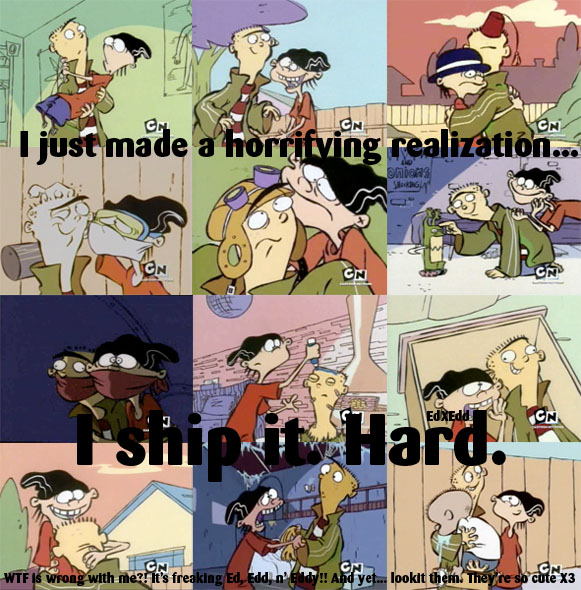 i.....i .... I just...I just-.. this thread I just...I JUST LOVE THIS SO MUCH WHAT HAPPENED TO MY CHILDHOOD OH GOD NOOO!On another note, this is not the first time I have heard of Edd and Eddy as a pairing. The first time was actually from my mother many many years ago(wow! ten!). We were watching the show and my mother kinda says to herself "huh, I wonder if double-D and Eddy are interested in each other, they sometimes seem kinda romantic," and I being but the tender age of eleven, and a full year away from my intrests in others of the same gender, say, "nah mom, double-D is a guy! they wouldn't be that way!" At this my mother kinda stumbles her words and says "oh! n-no I thought double-D was a girl you are right!"now that I think back on it... she never thought Edd was a girl, considering we were talking about the episode beforehand, and she referred to him as a "he" on several occasions.Not to mention I was talking to my mom about the first slash pairings of Spock and Kirk recently and she was all like "OH YEAH! I remember reading some of the things my friends would write back in the sixties!"oh man... my mother and I are more alike than I ever thought before. WHAT HAS THIS THREAD DONE!