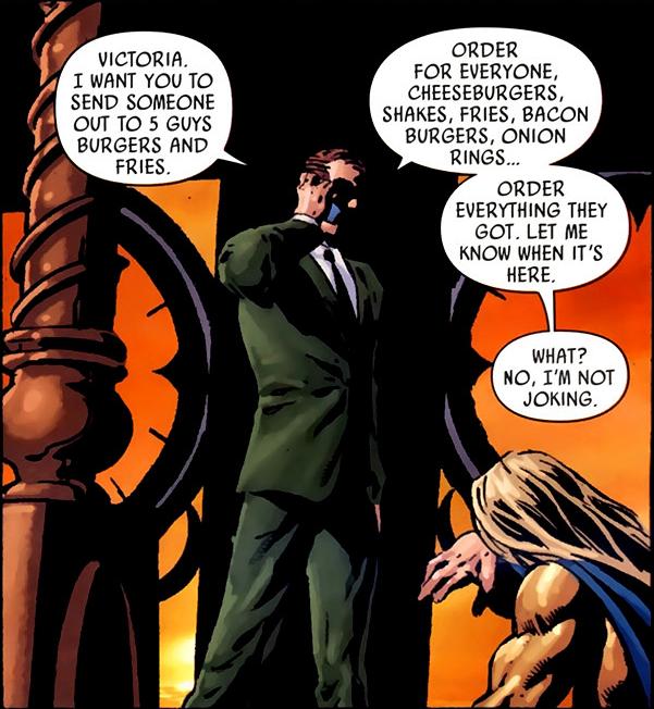 Draw the Dark Avengers, Enjoying some 5 guys burgers and fries.