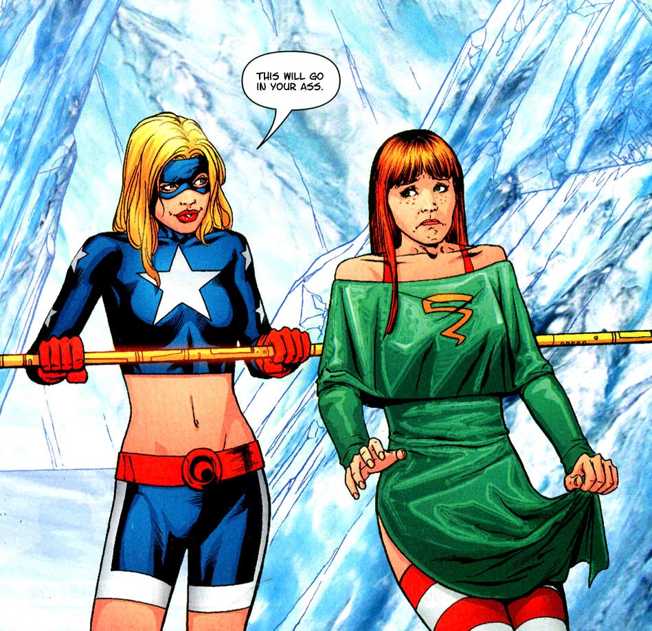 Stargirl and Cyclone, lezzing out on each other. It's up to you how explicit you want to make it (kissing, fondling, fucking), but it'd be cool if you could include Stargirl's braces and Cyclone's stockings.https://plus4chan.org/boards/pco/res/29620.html