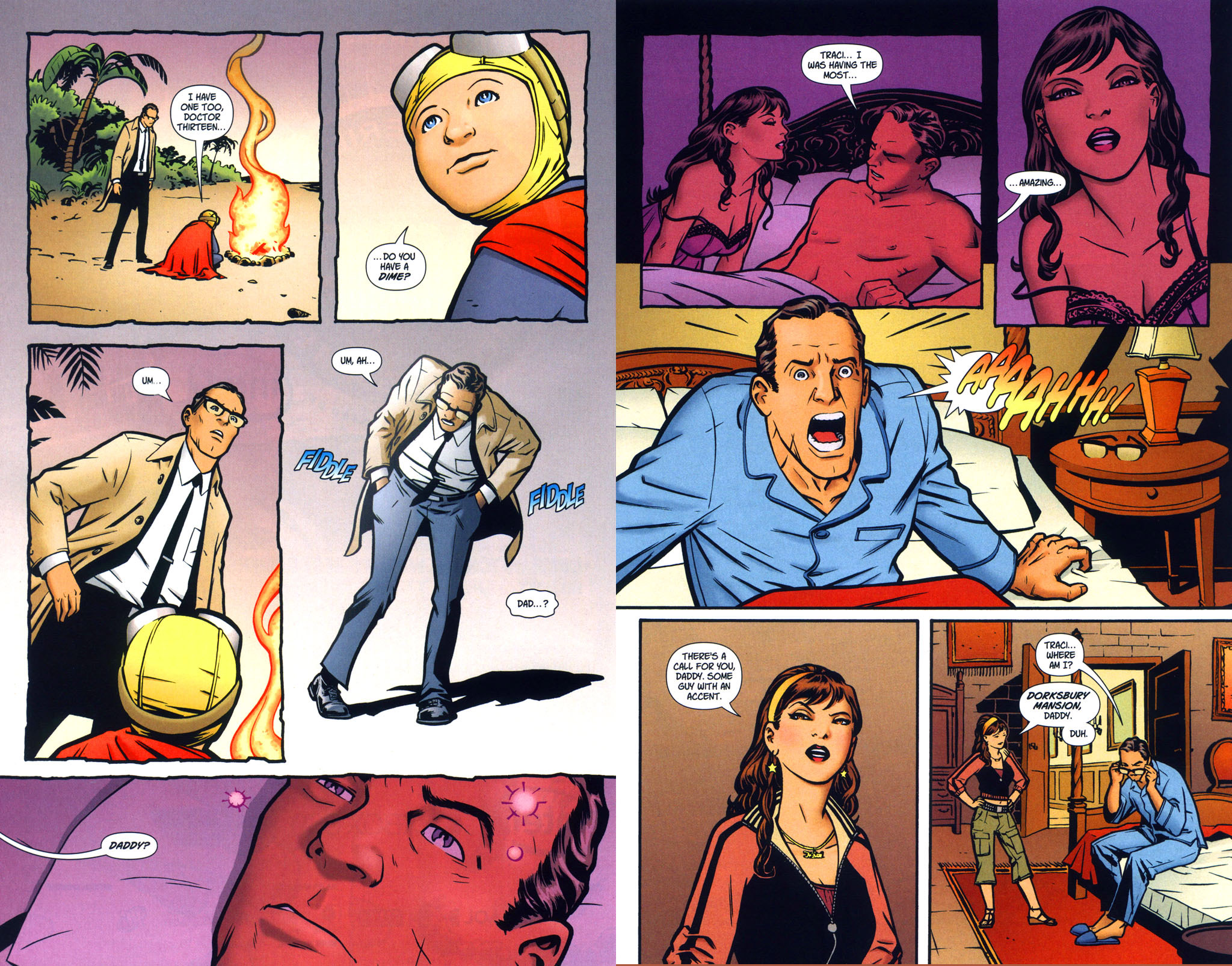 Traci Thirteen, naked except for her hairband and jewelry, sensually rubbing up against her dad, Dr. Thirteen, and sticking her tongue in his ear. Dr. Thirteen is standing stiffly and has a nervous look on his face. His speech bubble says: "I'm sure this is a metaphor for something."