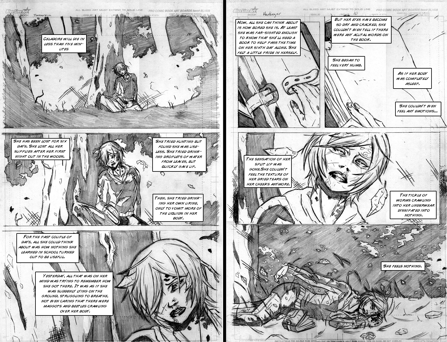 >>21460ewww worms.I'm not entirely sure you're conveying enough emotion here, but I also don't know the pages that precede this. You could try some less straightforward imagery. The text is trying to cover a lot of ground but the images don't feel quite wild or delirious just yet.