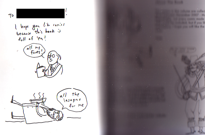 A little late with this, but MoCCA was a lot of fun the weekend before last. Good times, good people, and caught up with old friends. And got to meet a bunch of webcomic people to boot!Kate Beaton is a nice person, but seems to be super busy at conventions. She drew me a Garfield, I was very happy.