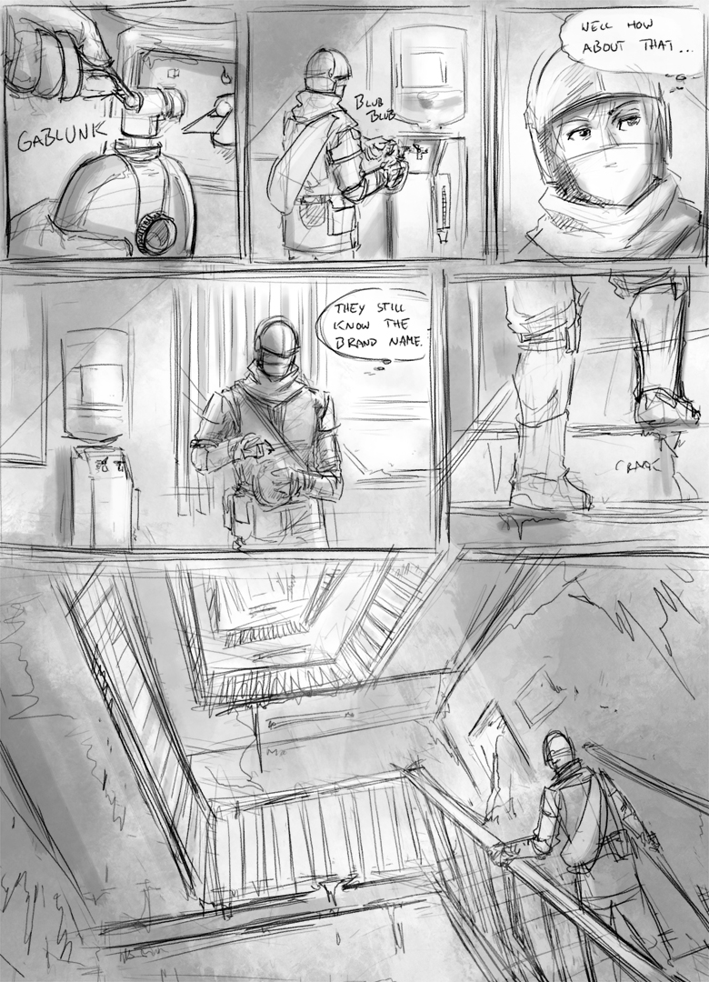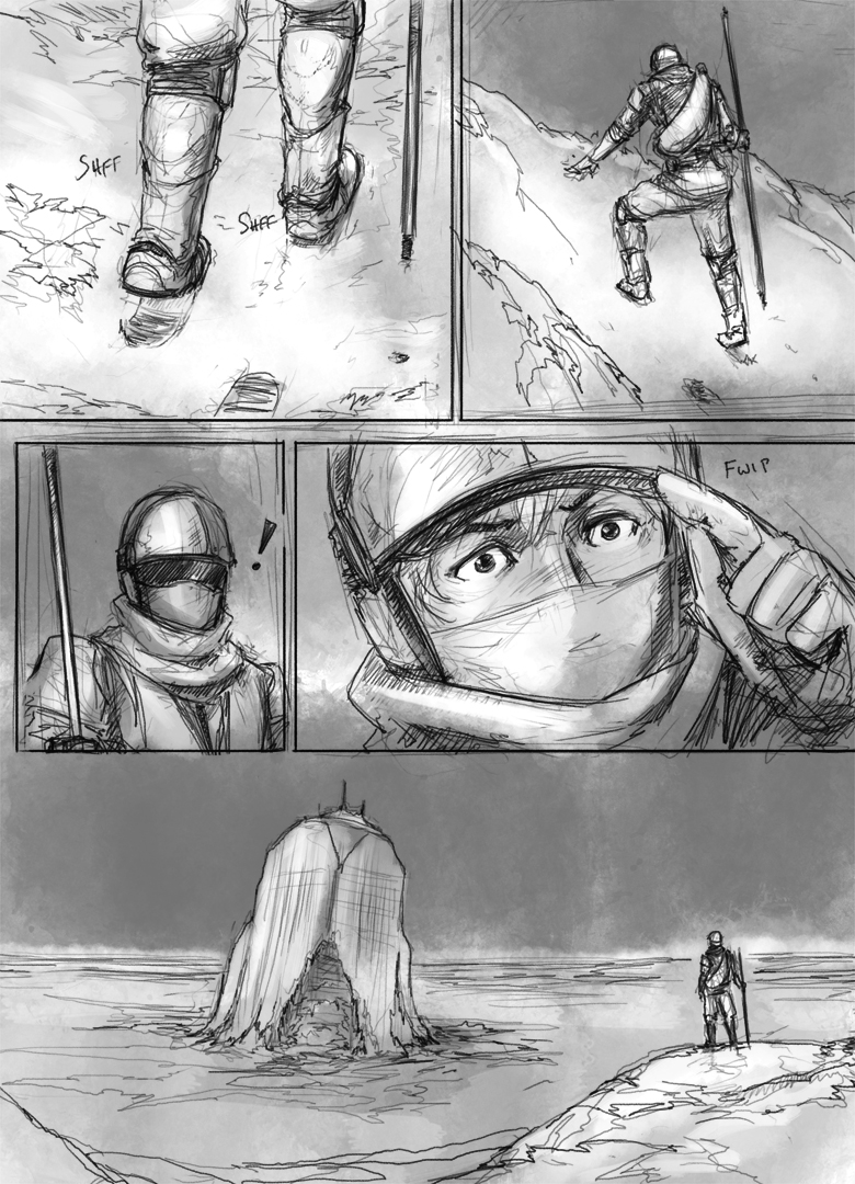 I like the pacing, it reminds me somewhat of BLAME! you take one part of your creativite of how the layout and paneling is done there? except maybe not the gigantic buildings and background but rather the mood and paneling more.