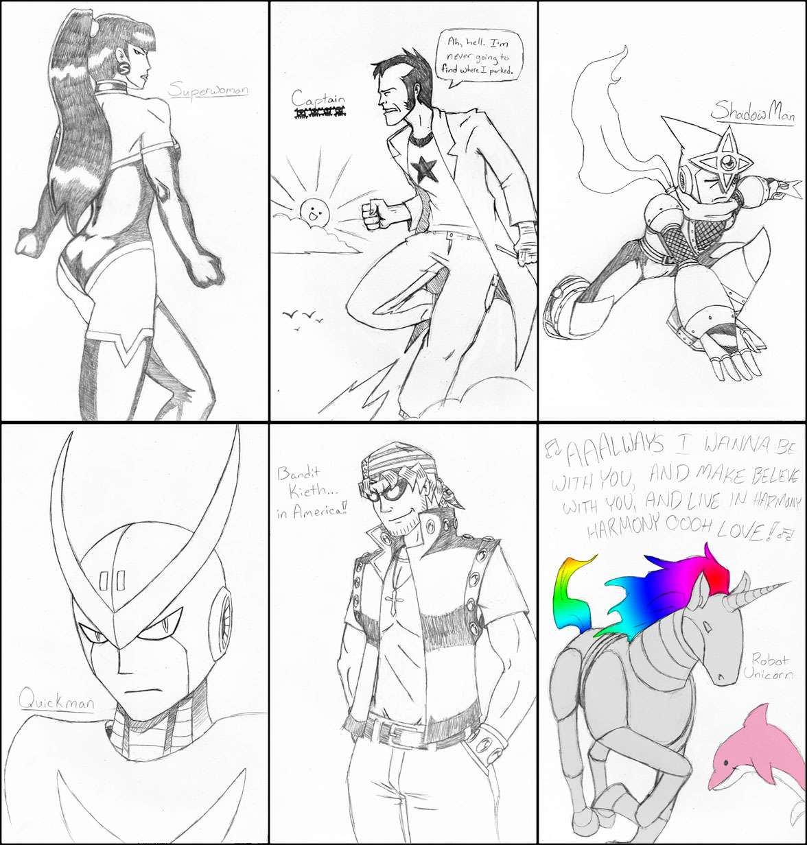 Heya /draw/!I'm a bad artist. I don't draw nearly as much as I should; I'll go for months without drawing a single thing. Thus, all the knowledge I've learned in art class about anatomy, perspective, how cloth should hang, colors, etc. tends to degrade until I can't remember it very well. I'm attempting to build up a good drawing habit, so I've challenged myself to draw at least one character in my sketchbook, six days a week. This is my first week trying it out, so I was hoping you could give me some feedback on what I can improve on. If nothing else, you can tell me what to draw in upcoming weeks.If anyone wants to redline a particular piece, let me know and I'll throw up the somewhat larger individual scanned drawing.