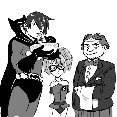 I don't know if you're unwilling to do anything with anime in it, but if you are, then I have a silly crossover request for you. Hei from Darker than Black dressed as Batman, with his partners Yin and Huang dressed as Robin and Alfred, respectively. If you watch the show, you'll know why. So here's Hei, otherwise known as Chinese Electric Batman.