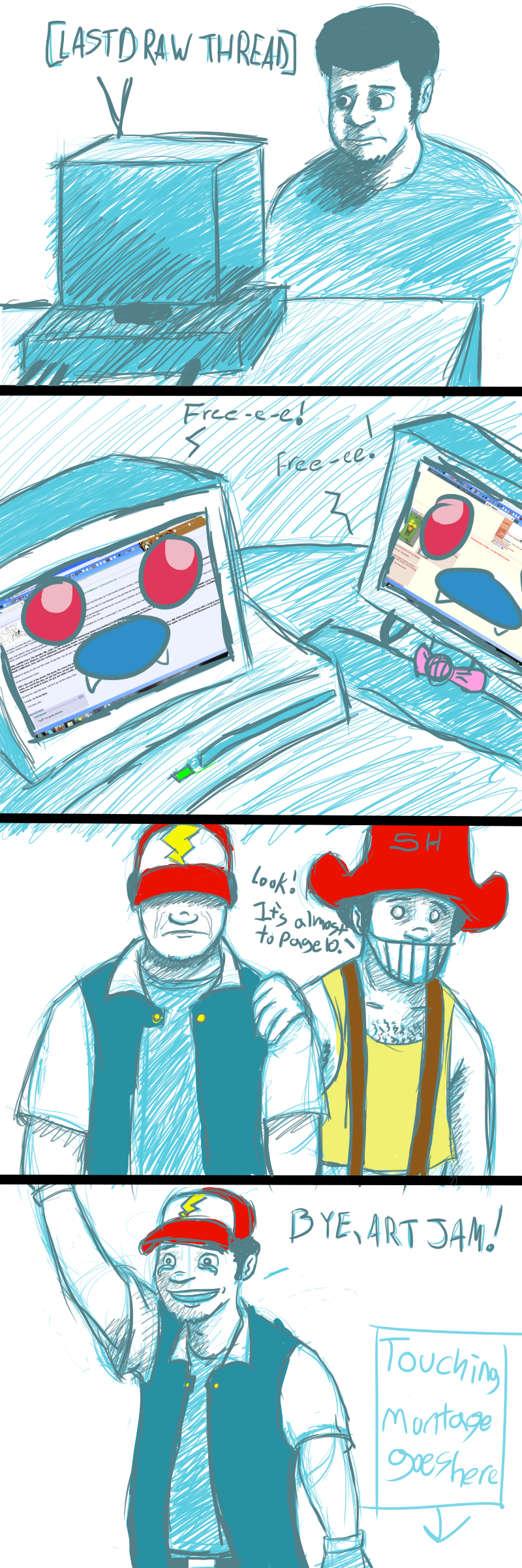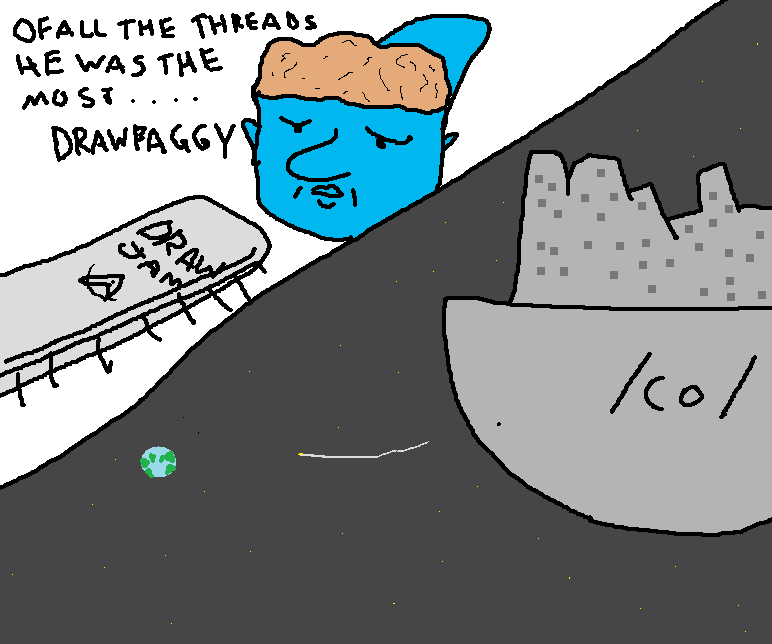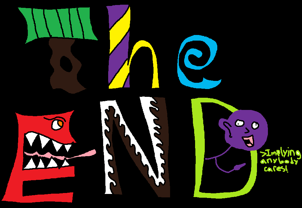 ...The End.I originally gonna post this last name, but Firefox fucked up and I lost the post, so I went to bed instead. Anyhow, here it is:I am a putting an end to the official /draw/jam threads. before you ask if it was because no one got that the last thread was an MST3K Thread well... YOU'RE RIGHT AND YOU'RE ALL BANNED.But seriously, it's more like this. I can't really keep up with it, sad, I know, but I work a lot, and the threads aren't as fun for me as when I started. But also, participation has been decreasing, meanwhile, the rest of the board has become more active, which is what I wanted. I'm happy about this. So, for all intents and purposes, this is the end.Though, that doesn't mean that you guys can't start your own art jams when the mood compels you. In fact, I encourage it. You can even make them last indefinitely. I just want to say thank you all for drawing. We do have one last theme but first I want to thank the following people:Pablo, Ludelia/Clara, The Sneaky Tiki, Jonix, Charlie Delta, Kosh, Vorked,George Nada/AGrovieGhoul (Toxie), Godless Communism, Astro, Little Bear, Dr. Gradamit, Dolphin HJ, Endpiece, Chaplain Larry Tremain, !ZXgC8JFv1g, Larz, Glamour, Doctor Girlfriend, The Phalnax, Banth, Crazy Bee, DUHRR, Sage Hoge, Tooth, Blue Jr., Shirou/Dragoon Darkfire, DVan, The Good Tripfag, Formaldehyde, Pseudonym, Crushling, j3, Batbro, smash, Hellströem, Dan, and the various anonymous artists who contributed. Instead of saying no one won this week, I'll say this: You all won. You are all winners in my book. Thank you all. So the final theme is this: [i]It's the end of the movie, the book, the story the thread. We all ride off into that sunset, try to stop the girl from getting in that plane, drive off a cliff, drive away from Vegas with a trail of destruction in our wake, we saved the day, we get the kiss, we get married, Chewie doesn't get a medal, the Ewoks dance, Mark Walbuhrg shoots us, we drive a taxie again, we head off to the Restaurant at the End of the Universe, we made it home, we got our white castle, we accept our pending execution, whatever the end means to you, you draw it."No time for rules this time. Just let it go, let the /draw/ flow.T.T.F.N., Ta Ta For Now.- You know who